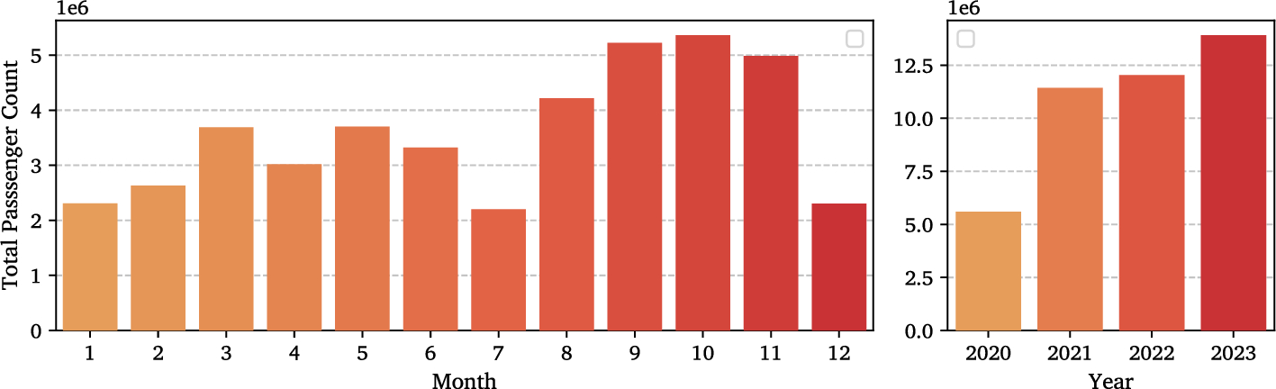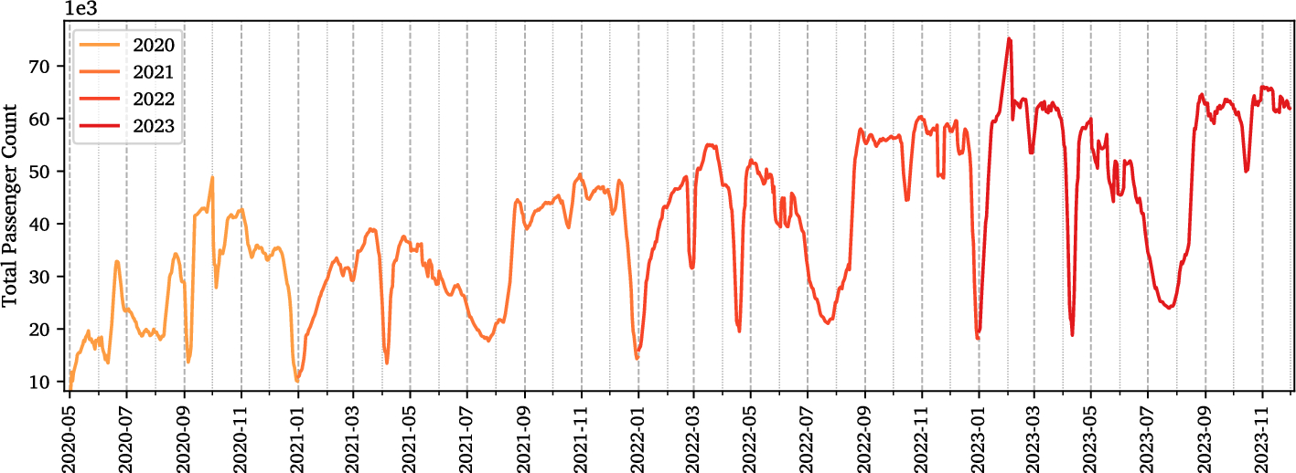 The term “horizon-agnostic” refers to the framework’s ability to predict passenger counts based on changes in input features within the domain of the training data, rather than predicting specific forecast horizons. This approach enables the models to be integrated into digital twins and simulation environments for scenario analysis and planning purposes.
