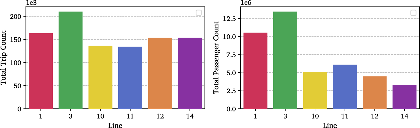 The APC dataset was extensively preprocessed to ensure data quality and consistency for subsequent analysis. As previously mentioned, the dataset’s foundation is the APC data, enriched with pertinent operational and spatiotemporal details. Figure 4 and Figure 5 show the total daily passenger counts across the entire dataset and for each bus line, respectively, highlighting the temporal trends and seasonal variations in the volume of passengers.