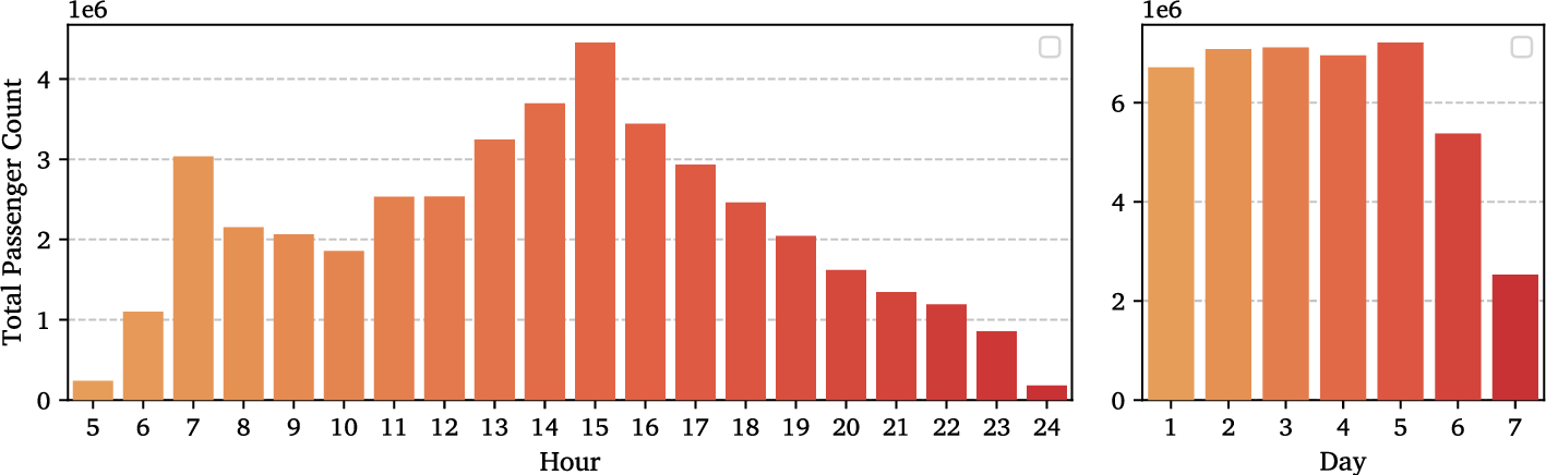 However, most studies on public transit forecasting aggregate passenger flows spatially across OD pairs (Li et al. 2022; Hu et al. 2024), time intervals (Shrivastava et al. 2024; Kong et al. 2024), or regions (Xu et al. 2023; Li et al. 2022). Such aggregation overlooks stop-level dynamics, inter-stop dependencies, and operational factors, while also limiting the model’s predictive window and generalisation over time. Forecasts of public transit operations can provide direct benefits to passengers by providing insight into wait times, bus delays, and system congestion Qu and Xu (2020); Shrivastava et al. (2024), thus enabling more informed mobility decisions. In addition, although the effects of external factors on human mobility dynamics have been established, few studies (Hu et al. 2024; Xu et al. 2023; Zhang et al. 2021) take this information into account within their ML/DL predictive frameworks and when done, only individual ones are considered. This highlights the need for a comprehensive investigation into the effects of said externalities on modelling stop-level dynamics of bus transit systems.