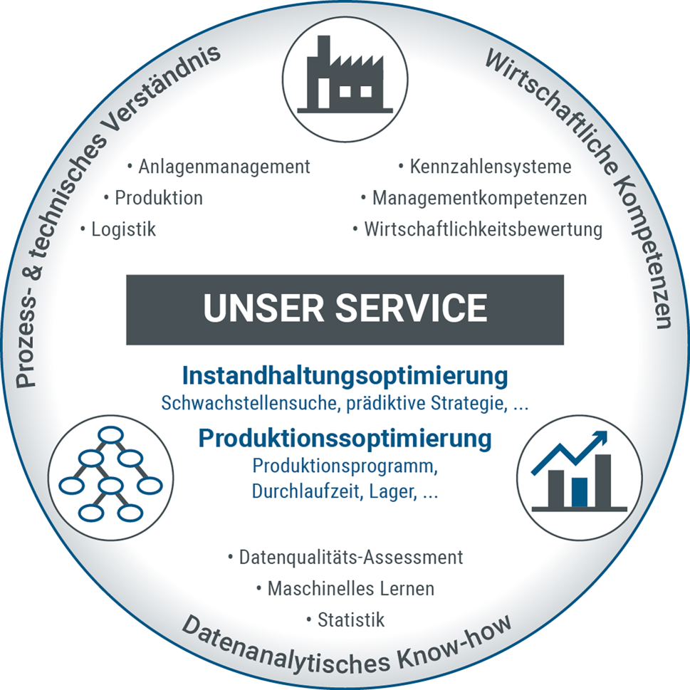 Durch die Ausbildung in unterschiedlichen Schwerpunkten besitzt das Datenanalytik-Team des Lehrstuhls für Wirtschafts- und Betriebswissenschaften genau diese Sichtweise. In der Optimierung von Instandhaltung und Produktion wird das Prozess- und Technikverständnis mit wirtschaftlichen Kompetenzen kombiniert. Dies ermöglicht es, maßgeschneiderte, wissenschaftlich fundierte Lösungen und Entscheidungshilfen zu entwickeln (Abb. 1).