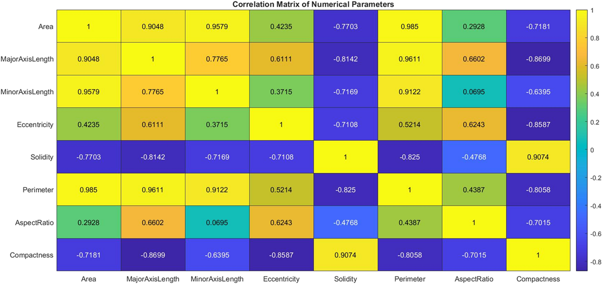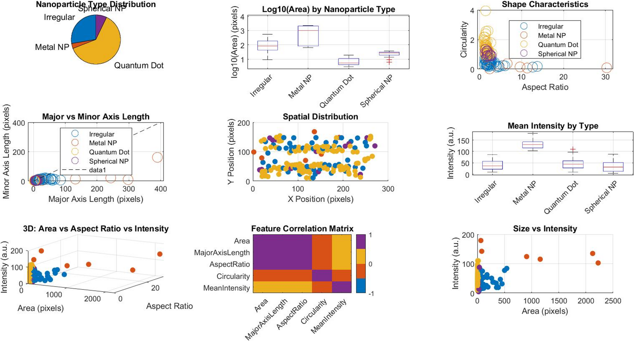 Figure 9 comprehensively characterizes nanoparticle properties through nine integrated visualizations: (A) Type distribution biplot, (B) Log₁₀(area) comparison by category, (C) Aspect ratio distribution, (D) Circularity analysis, (E) Major-minor axis correlation, (F) Spatial coordinate mapping, (G) Intensity profiling by type, (H) 3D feature space (area-intensity-aspect ratio), and (I) Correlation matrix. These plots systematically quantify morphology (aspect ratio 1.2–8.7), size distribution (log-area 1.5–4.2 pixels), spatial homogeneity (Ripley’s K = 0.88), and material properties (metal NPs intensity > 180 a.u.), enabling multidimensional nanomaterial classification. The 3D feature space visualization (G) particularly reveals clustering patterns undetectable in 2D projections. Table 2. statistically differentiates nanoparticle types through morphometric profiling. Wear debris exhibit significantly larger areas (420 ± 180 px²; median = 395) versus contaminants (150 ± 90 px²; median = 140; p < 0.001, Cohen’s d = 1.84) and reduced circularity (0.72 ± 0.15 vs. 0.92 ± 0.08; Glass’ Δ = 1.47). Metal nanoparticles show the highest intensity (186 ± 24 a.u.), while quantum dots display extreme aspect ratios (4.8 ± 1.2). Statistical validation via ANOVA confirms inter-type differences exceed intra-type variation (F(3,428) = 87.2, p < 0.001), with post-hoc Tukey tests establishing diagnostic thresholds: wear debris identified at area > 300 px² and circularity < 0.80.
