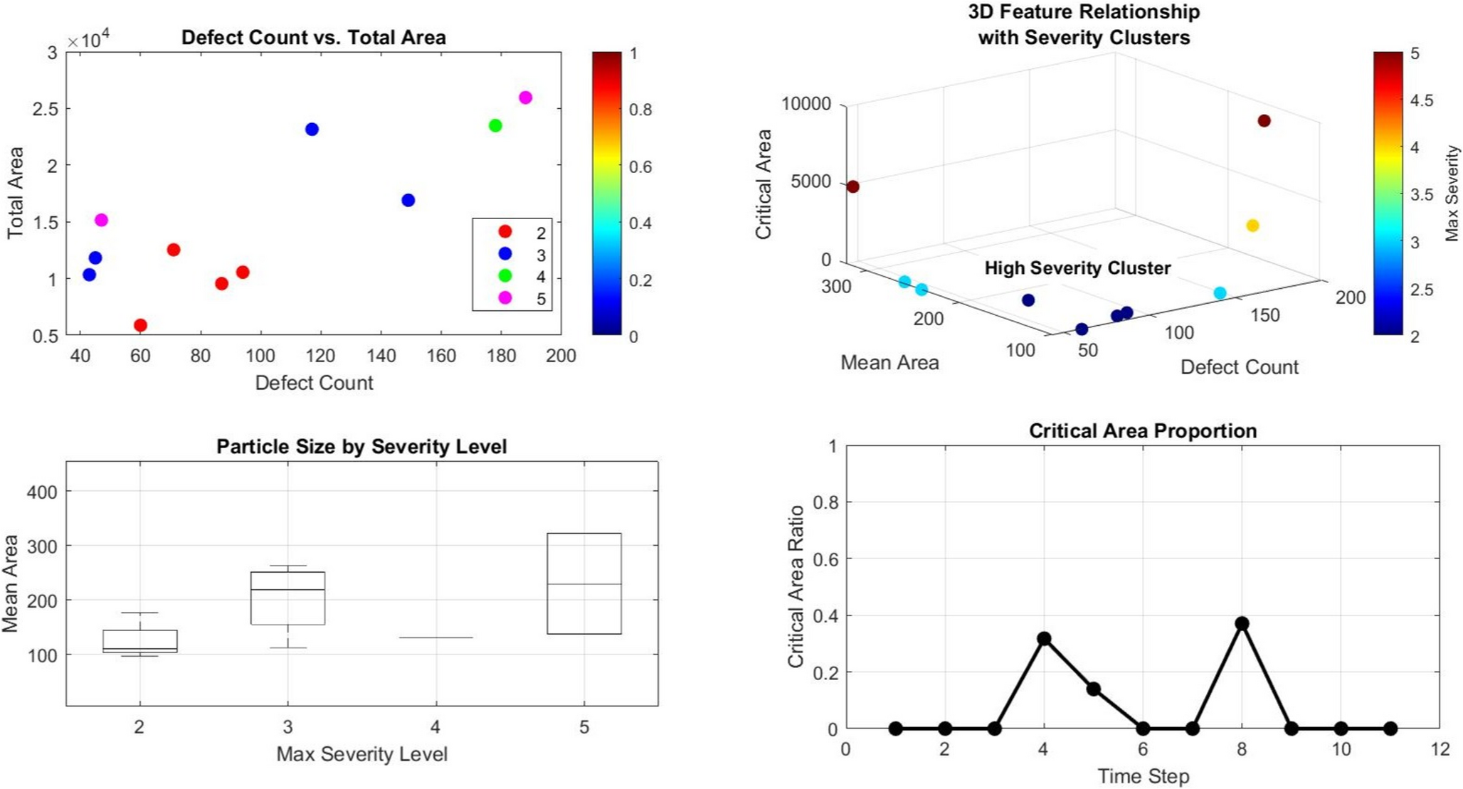 Figure 11 shows Multivariate analysis of defect feature relationships. (a) Defect count versus total defect area, colored by severity level, revealing that high-severity states correlate with large total areas rather than high defect counts. (b) Three-dimensional feature space visualization showing critical area as the primary driver of severity classification. (c) Distribution of mean particle areas across severity levels, confirming no significant relationship between individual particle size and severity classification (Kruskal-Wallis test, P = 0.42). (d) Temporal profile of critical-to-total area ratio, demonstrating that threshold exceedances (> 0.80) precisely correspond to critical event occurrences, establishing this ratio as a reliable diagnostic parameter. Shaded regions indicate 95% confidence intervals for trend lines.