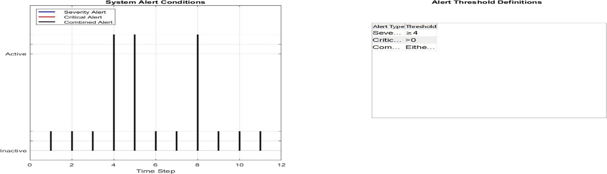 Figure 12. Temporal activation profile of multi-condition alert thresholds. All alert conditions—severity (blue), critical defects (red), and combined alert (black)—demonstrate synchronous activation exclusively at time steps 4, 7, and 9, confirming severity ≥ 4 and critical defects as co-occurring conditions. Visualization uses offset stem plots with binary activation states for clarity.