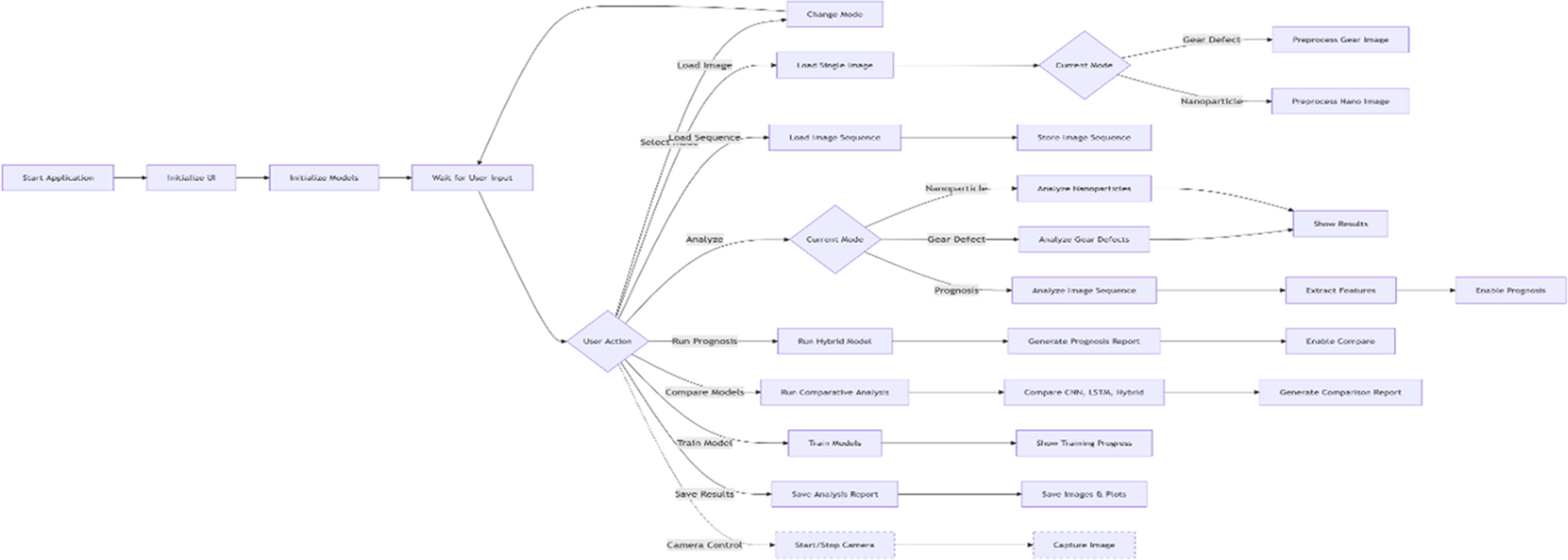 Diagram 1 details the application workflow and future work: Starting from application launch, the user interface and models are initialized, followed by awaiting user input. User actions include mode selection (switching between gear defect and nanoparticle analysis), loading a single image or an image sequence, and performing analysis according to the selected mode. Preprocessing is performed separately for gear and nanoparticle images. Image sequences are stored for further processing. Analysis options include gear defect detection, nanoparticle analysis, and prognosis through hybrid modeling. Results are displayed and features extracted to enable prognosis functionality. Additional capabilities include running prognosis reports, comparative model analysis (CNN, LSTM, Hybrid), training models with progress feedback, and saving analysis reports and related images. Future work plans focus on adding camera control features, including starting/stopping the camera and capturing images directly within the application.