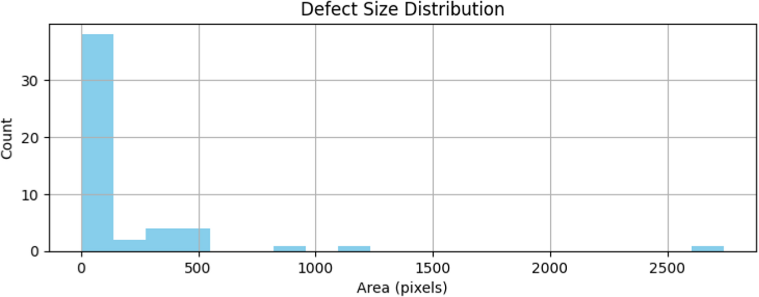 Figure 3: Defect size distribution in gear defect mode, showing the frequency count of defects by area (in pixels) to illustrate size distribution patterns.