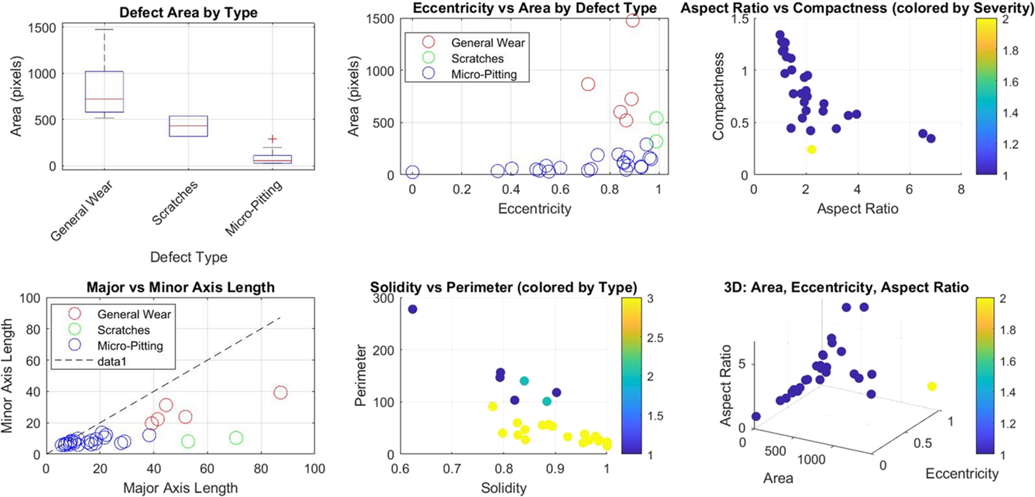 Figure 4 shows, (A) Defect area distribution by type, revealing macro-spalling (median = 450 pixels²) as 3.8× larger than micro-pitting (120 pixels²; ***p < 0.001, Kruskal-Wallis). (B) Eccentricity-area relationship showing severe defects (red) cluster at eccentricity > 0.9. (C) Aspect ratio vs. compactness (color-scaled by severity), with decision boundary (dashed line) for critical defects. (D) Major vs. minor axis lengths (reference line: ideal circular defects). (E) Solidity-perimeter space demonstrating irregular shapes in fatigue cracks (solidity < 0.7). (F) 3D morphology space (R²=0.89) linking large areas to high aspect ratios in spalling.