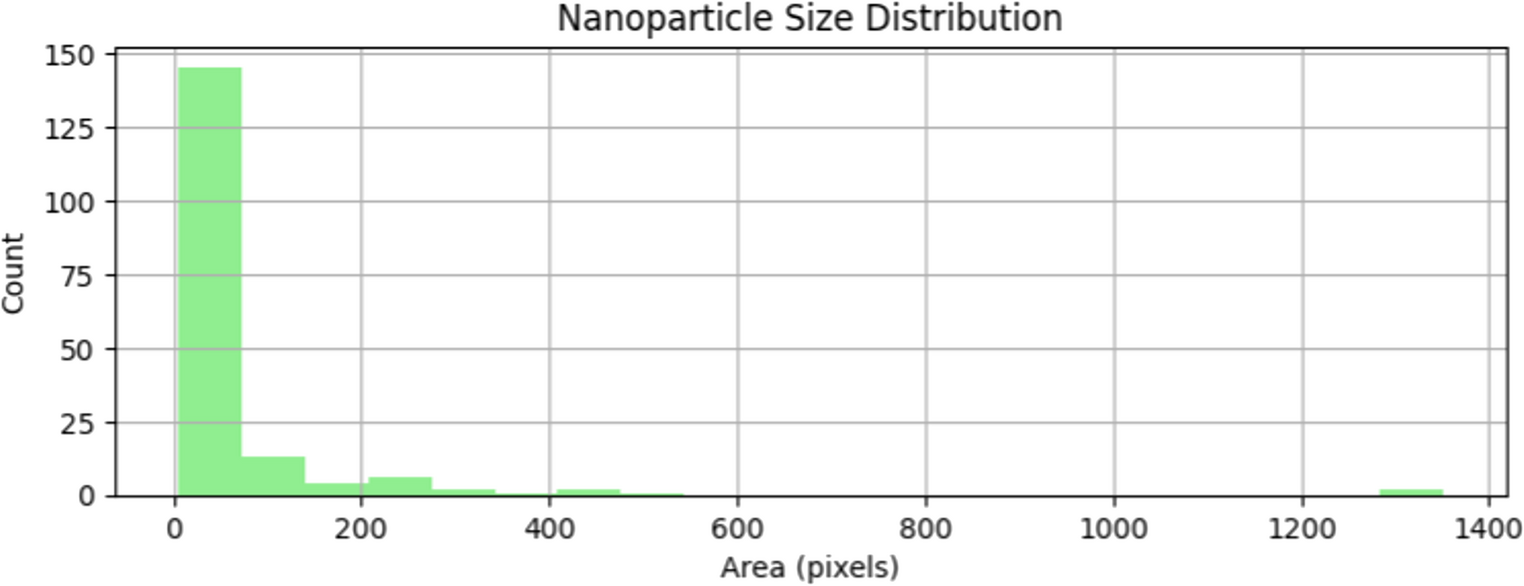 Figure 8: Nanoparticle mode—size distribution showing the relationship between nanoparticle area (in pixels) and frequency count, illustrating the particle size distribution pattern.