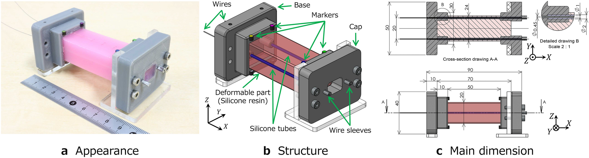 I have proposed a wire-pulling mechanism with embedded soft tubes (Fig. 1) as a method to incorporate wires into a soft body. This method produces a soft robotic tongue capable of deforming along multiple DOFs without the wire tearing the tongue. In addition, because the soft tube can be fixed and embedded during molding, it is easier to manufacture than an Anton tongue. In a similar study, Lee et al. used a soft tube to pass a shape memory alloy wire through a soft body [13]. However, the Shore hardness of that soft body was greater than that of A40, which is harder than the soft body used in this study and has better tear resistance. Furthermore, the soft tubes were not used to reduce wear between the wire and the soft body, so the effect of the soft tubes on durability was not assessed.