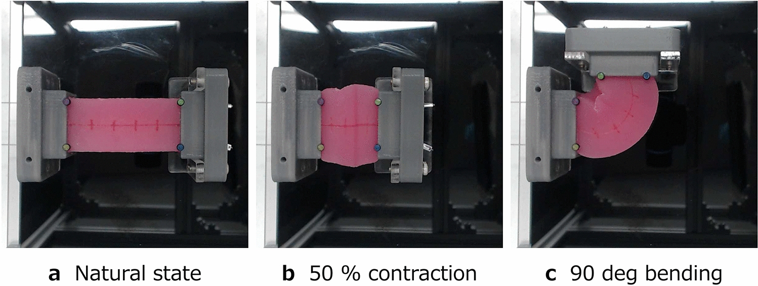 The contraction and bending deformations are shown in Fig. 3. A contraction of 50% of the natural length and a cap angle of 90° have been achieved. At a plasticizer mixing ratio of 10 wt%, the tensile force required for 90° bending was about 15 N when the length of one wire was fixed at the initial length and the other wire was pulled. The deformable part was repeatedly bent by wire tension during durability tests, and the addition of a soft tube increased the number of cycles until the silicone resin was torn by the wire by > 10 times [14].