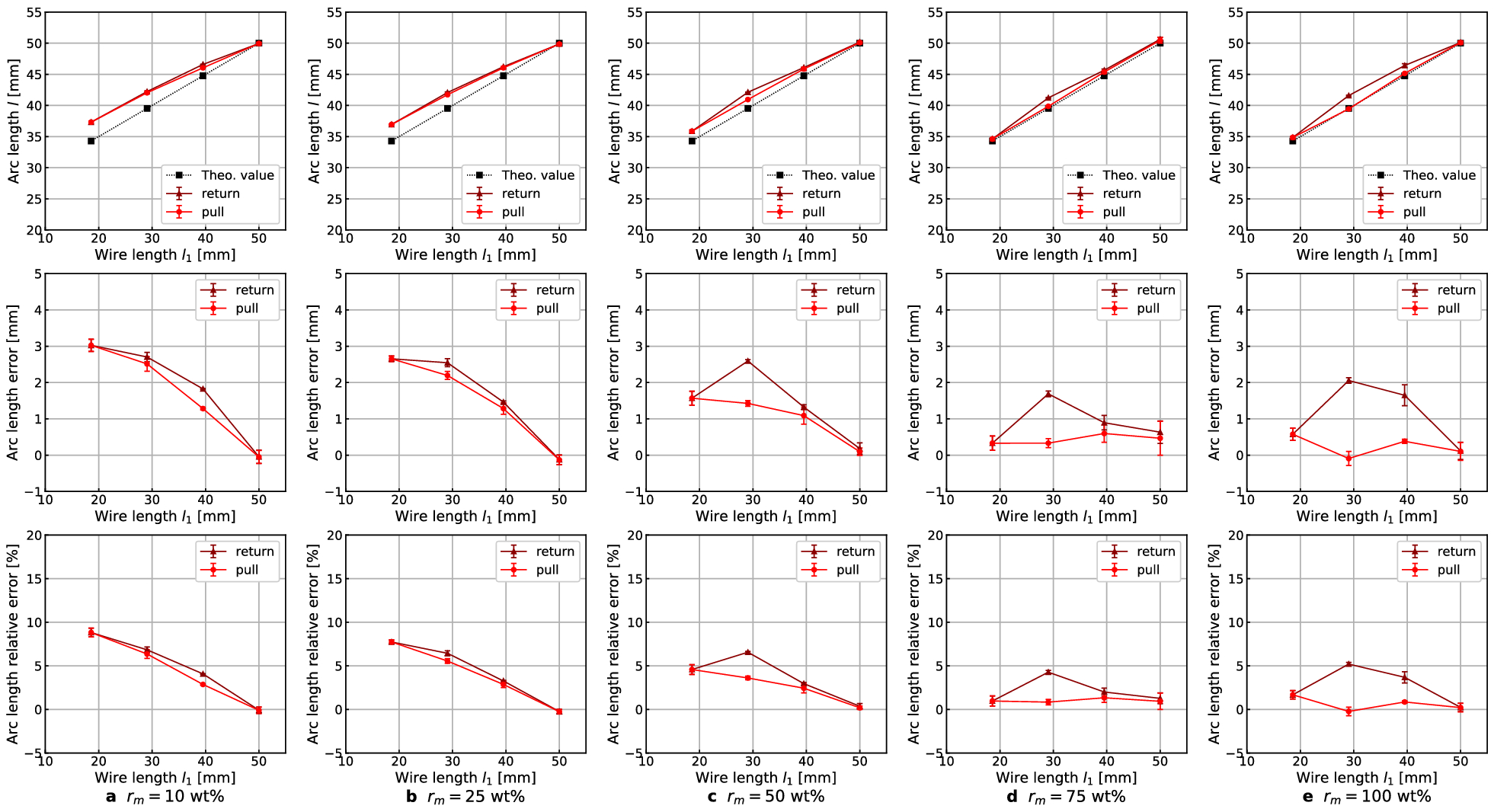 The root mean square (RMS) of the errors and the relative errors are shown in Fig. 11 to evaluate the effect of the hardness of the deformable part. The error of the neutral arc length l during pulling decreases as the plasticizer mixing ratio increases (Fig. 11a). However, the differences between the errors during pulling and return increase as the plasticizer mixing ratio increases. Consequently, the error in return decreases until the plasticizer mixing ratio is 75 wt%, but increases at 100 wt%. The error of the cap angle \(\theta \) was large only when the plasticizer mixing ratio was 10 wt%; at other ratios, the error was almost constant (Fig. 11b). In addition, there was no difference between the errors during pulling and return.