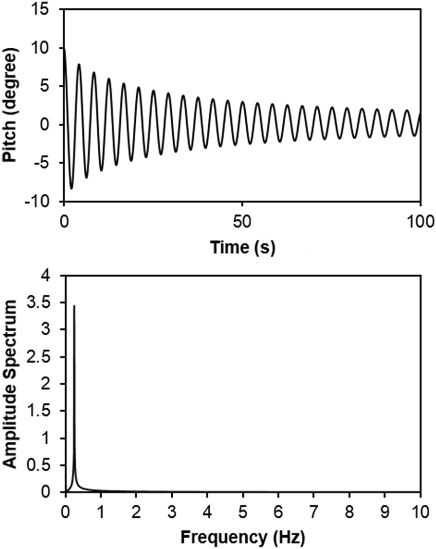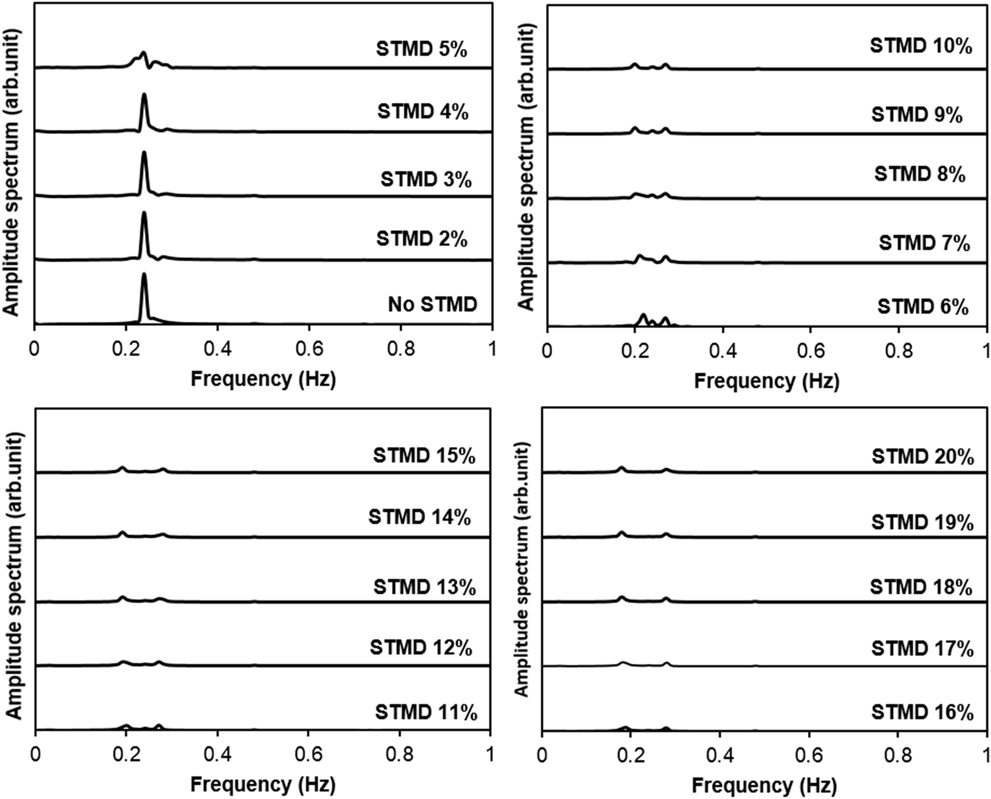 To evaluate the performance of the STMD in a passive mode at each mass ratio (2% to 20%), a resonance condition, as the most destructive condition, was considered in the simulation. For this purpose, the buoy structure model in PDS was simulated facing incoming waves with a frequency that equals the natural frequency of the buoy structure, i.e., 0.24 Hz. Fig. 14 shows the frequency domain response of the buoy structure against a wave at a frequency of 0.24 Hz, for the mass ratio of the 2% to 20%. As expected, the STMD is able to suppress the pitch deviation of the buoy in a passive mode in a resonance condition. The rate of suppression increases as the mass ratio raises. However, a large weight may rise many difficulties in practice such as higher material cost, larger required transportation equipment and hardship of deployment and installation