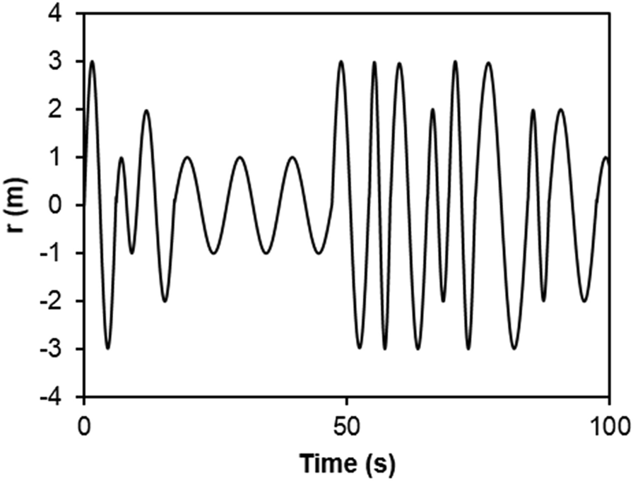 where H, k, \(\omega\), and x are the wave height (i.e., crest to trough), the wave number, the wave frequency, and the horizontal position of the floater with respect to the origin at the mean water level, respectively. Here, the x is a constant value because the floater has only a heave motion and its horizontal location is assumed to be fixed. The water surface elevation is a result of the elliptical motion of the water particles. The vertical and horizontal motion of the water particles in the floater’s location (with respect to the origin) could be written as follows: