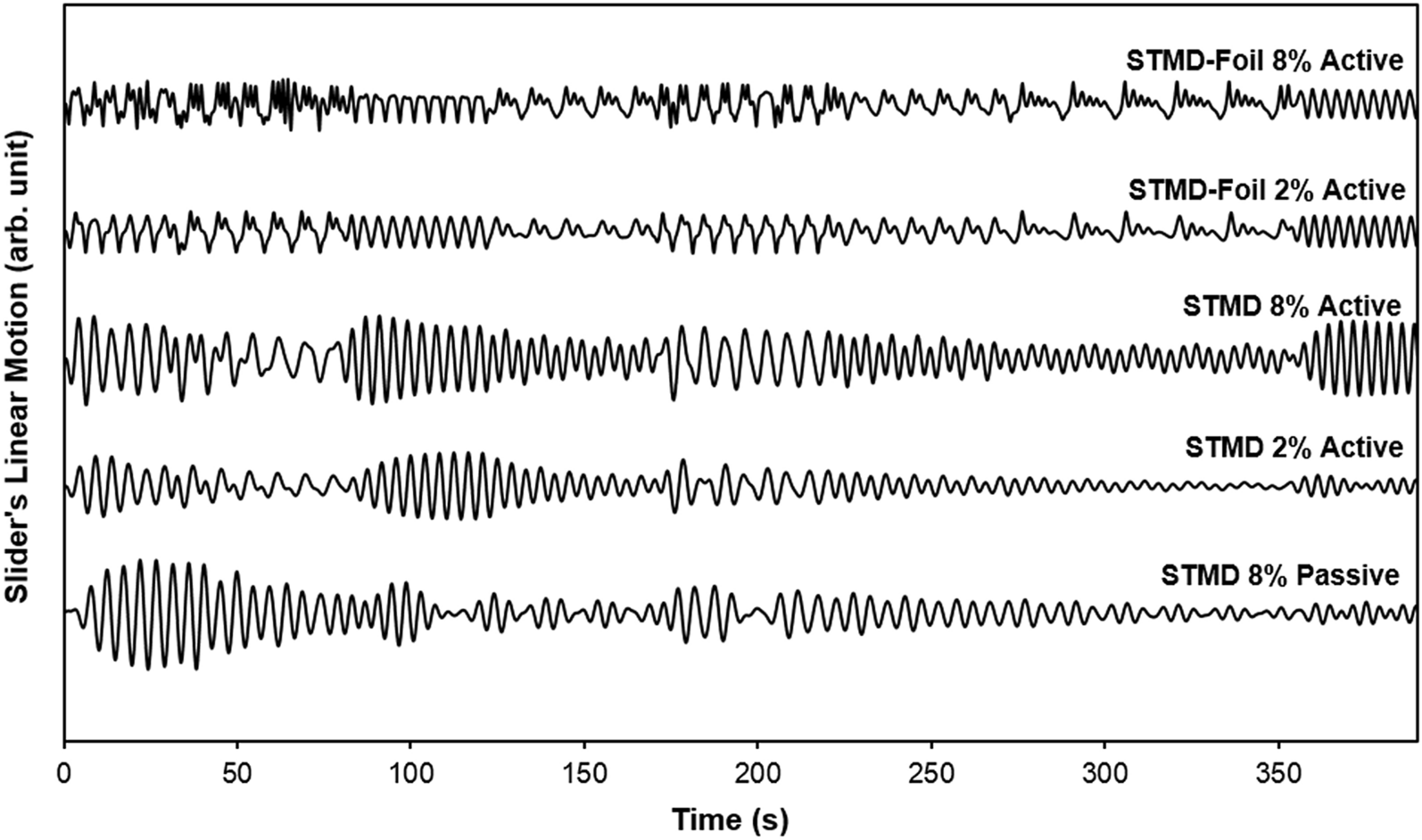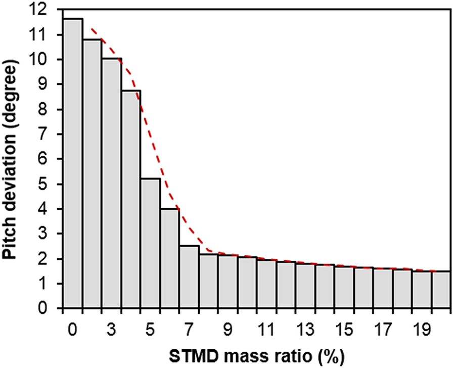 [34]. Therefore, a reasonable mass ratio should be selected considering both weight and suppression rate in each case. A standard deviation of the response at each case shown in Fig. 15 clearly demonstrates that in passive mode, increasing the mass ratio of the slider up to 8% rises the suppression rate of pitch deviation by 81.3% in resonance condition. Above 8%, the suppression rate remains almost unchanged. Therefore, the 8% mass ratio for the slider is selected as a proper ratio in getting a reasonable vibration suppression in passive mode.