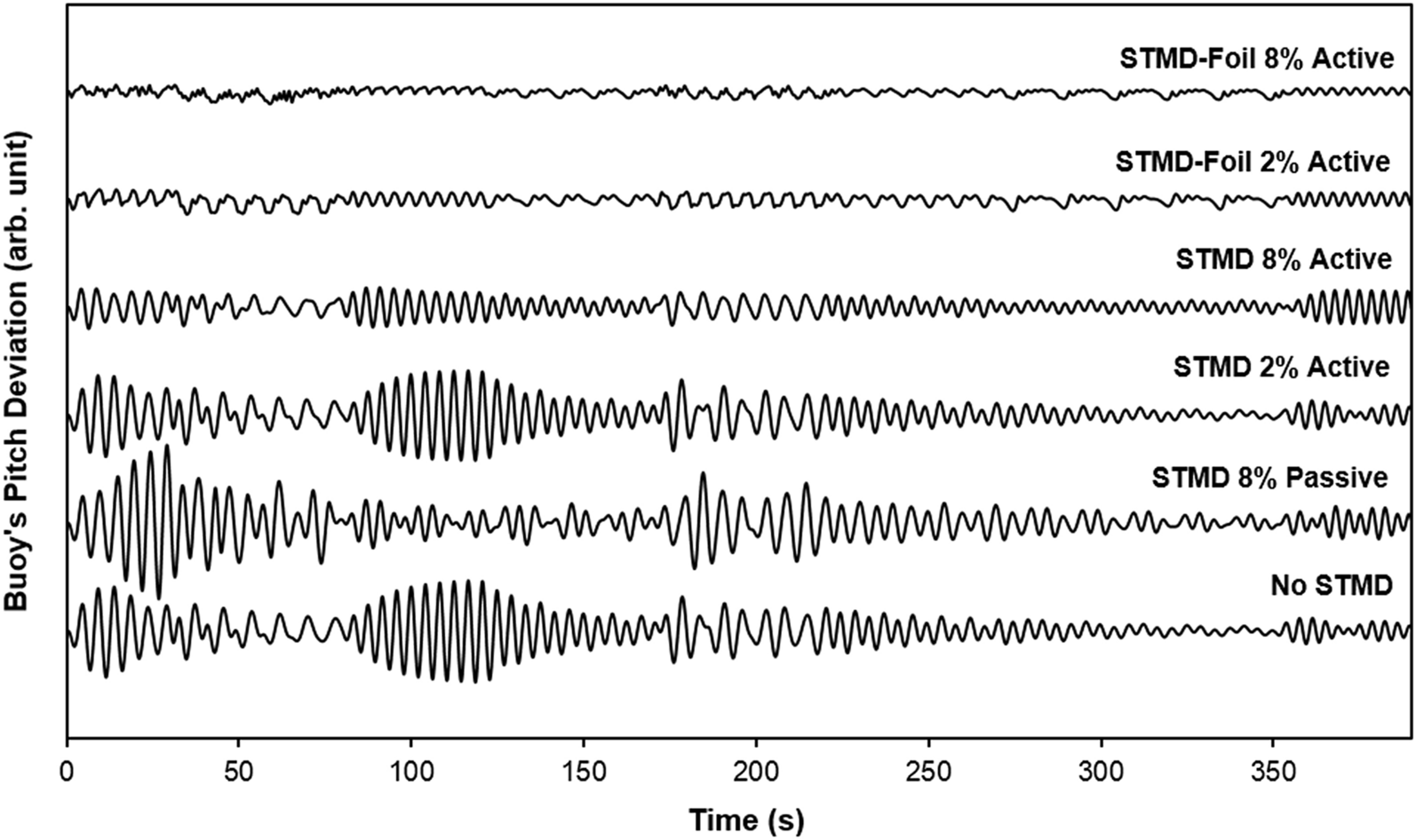 Time-domain response of the buoy with different control strategies Buoy’s pitch deviation with proposed control strategies in response to a series of continuous waves with different heights and periods is presented