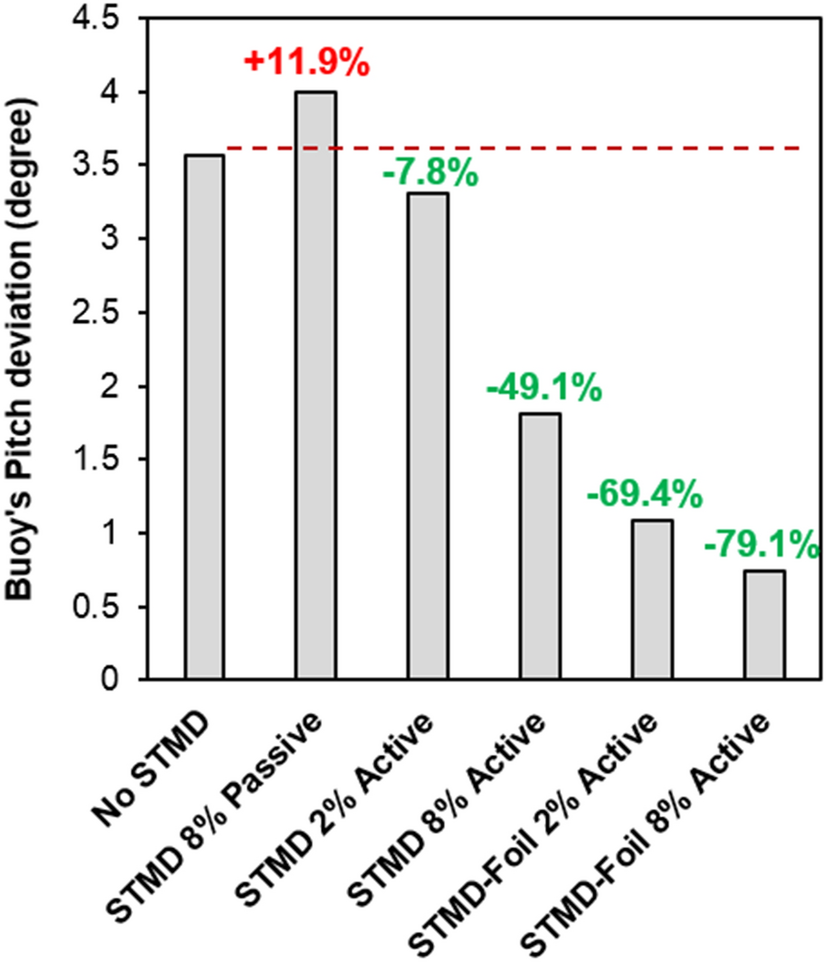 Response of the buoy with different control strategies A standard deviation of the buoy’s pitch deviation with proposed control strategies in response to a series of continuous waves with different heights and periods is presented