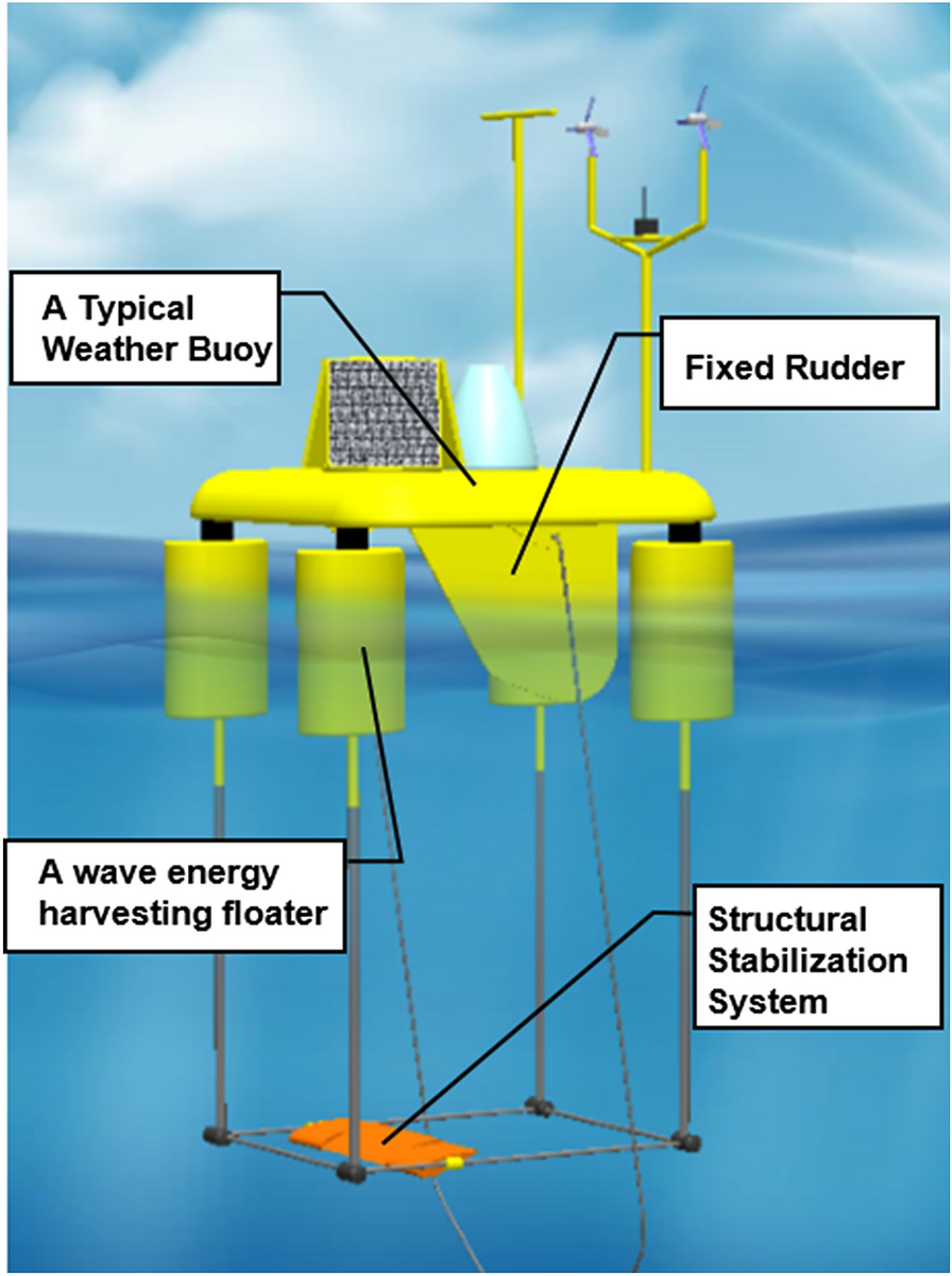 Concept of final stabilized buoy. Three main parts of proposed stabilized buoy structure, a typical weather buoy with a fixed rudder, four wave energy harvesting floaters at each corner of the buoy, and the structural stabilization system are shown in the figure