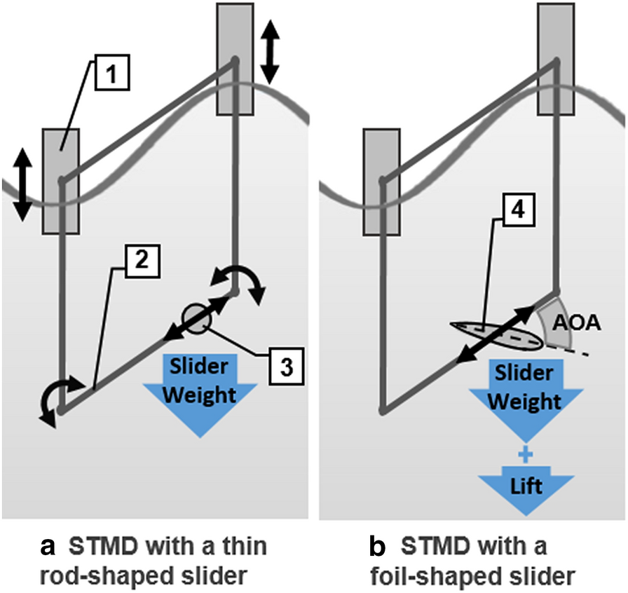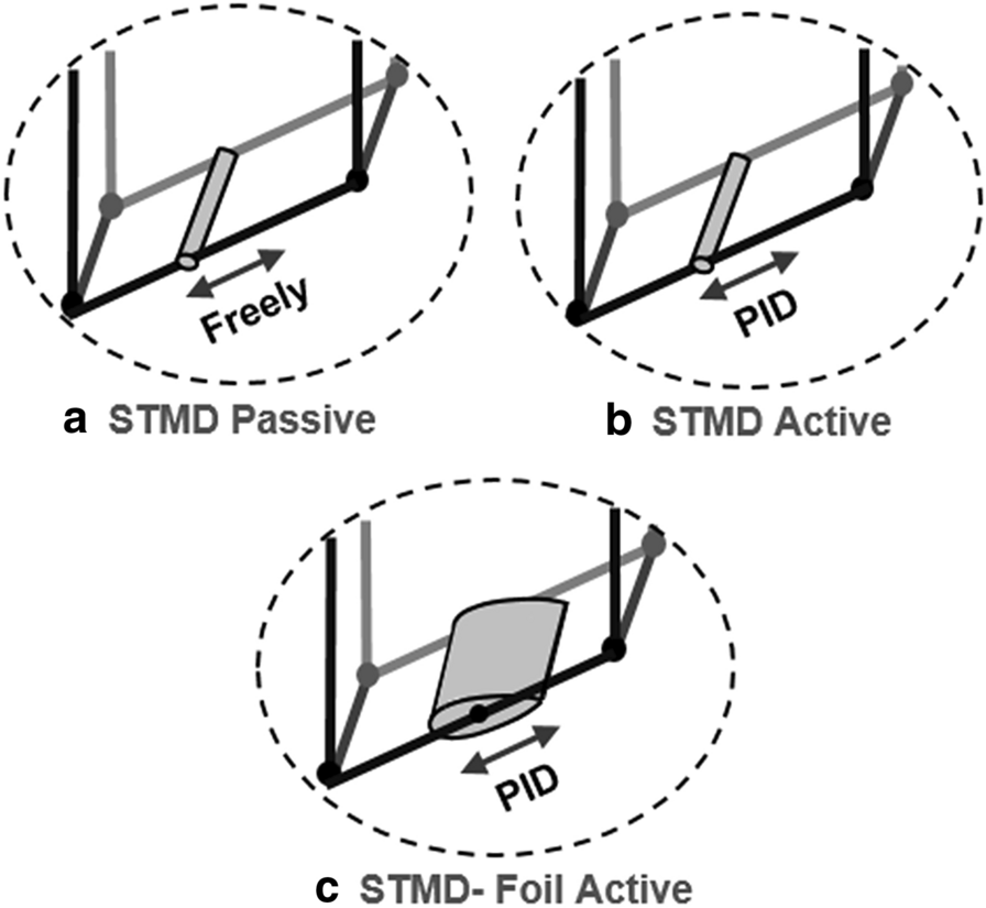 The controlling approaches studied in this research are based on a combination of the STMD concept and the foil effect. First, the control of the thin rod-shaped slider in the passive mode (see Fig. 5a) is explained. Then to confirm the efficiency of the STMD combined with a foil, the active mode control is studied in both thin rod and foil-shaped sliders, as schematically shown in Fig. 5b, c, respectively.