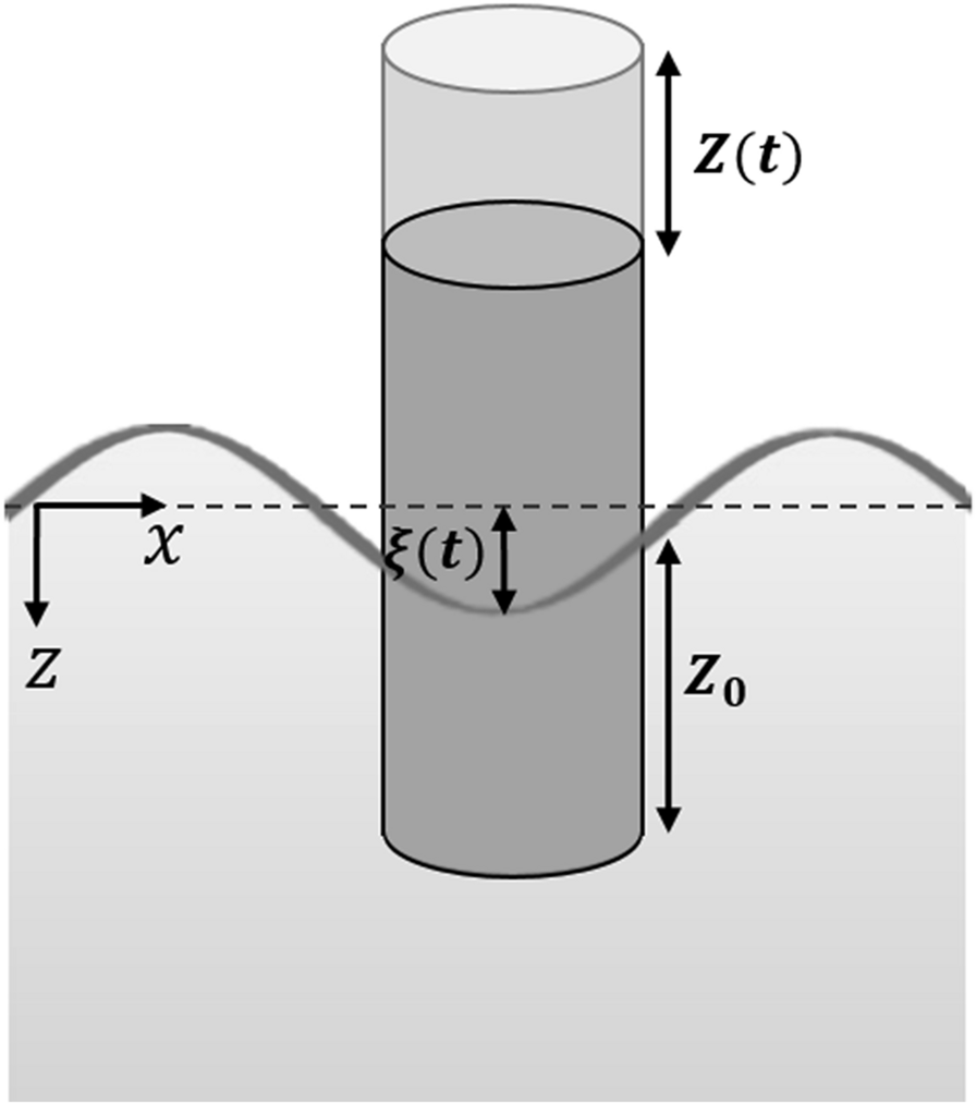 where d is the water depth and the Z(t) is a vertical displacement of the floater, which does not necessarily follow the water surface elevation \(\xi (t)\) (see Fig. 3). Note that the \(Z_0\) in Fig. 3 is the immersed height of the floater at its stationary condition