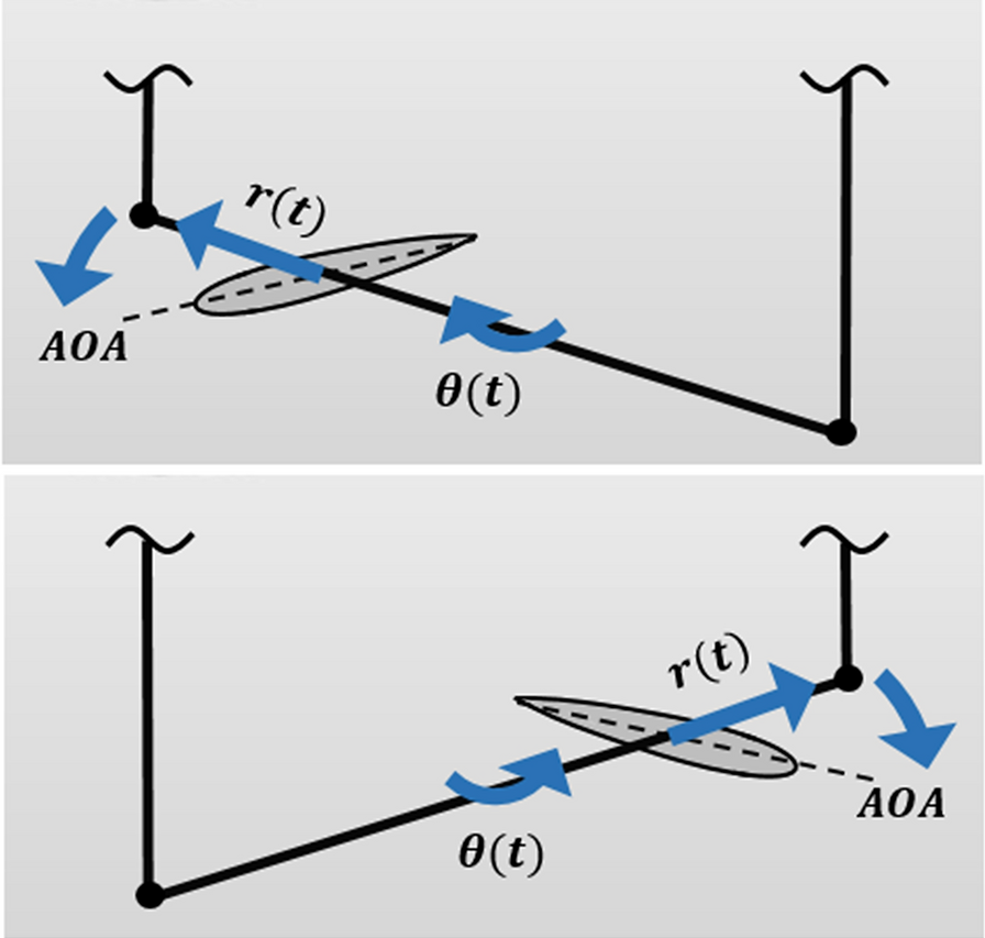 Active control of foil-shaped slider. The figure shows the direction of the slider’s linear motion r(t) and its rotaion (AOA) with respect to the frame, in two cases of clockwise (upper figure) and counterclockwise (below figure) pitch deviation \(\theta (t)\) of the frame