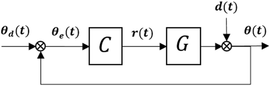 Active control block diagram. The pitch stabilization control flow is shown in this figure. The control plant G consists of the whole structure of buoy together with stabilization mechanism. \(\theta\) and \(\theta _d\) are the observed and the desired pitch angle (i.e., zero degree) of the buoy, respectively. The controller C gets the pitch deviation \(\theta _e\) and sends the proper linear displacement r of the slider to the G. Wave induced external forces are input as a distubance d to the system