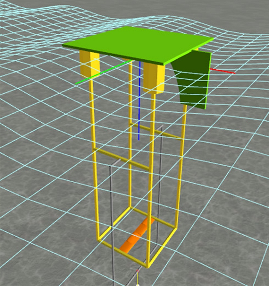 Simulated model in the PDS environment. A typical buoy with a fixed rudder attached to the four floaters at corners and the submerged stabilization system is shown