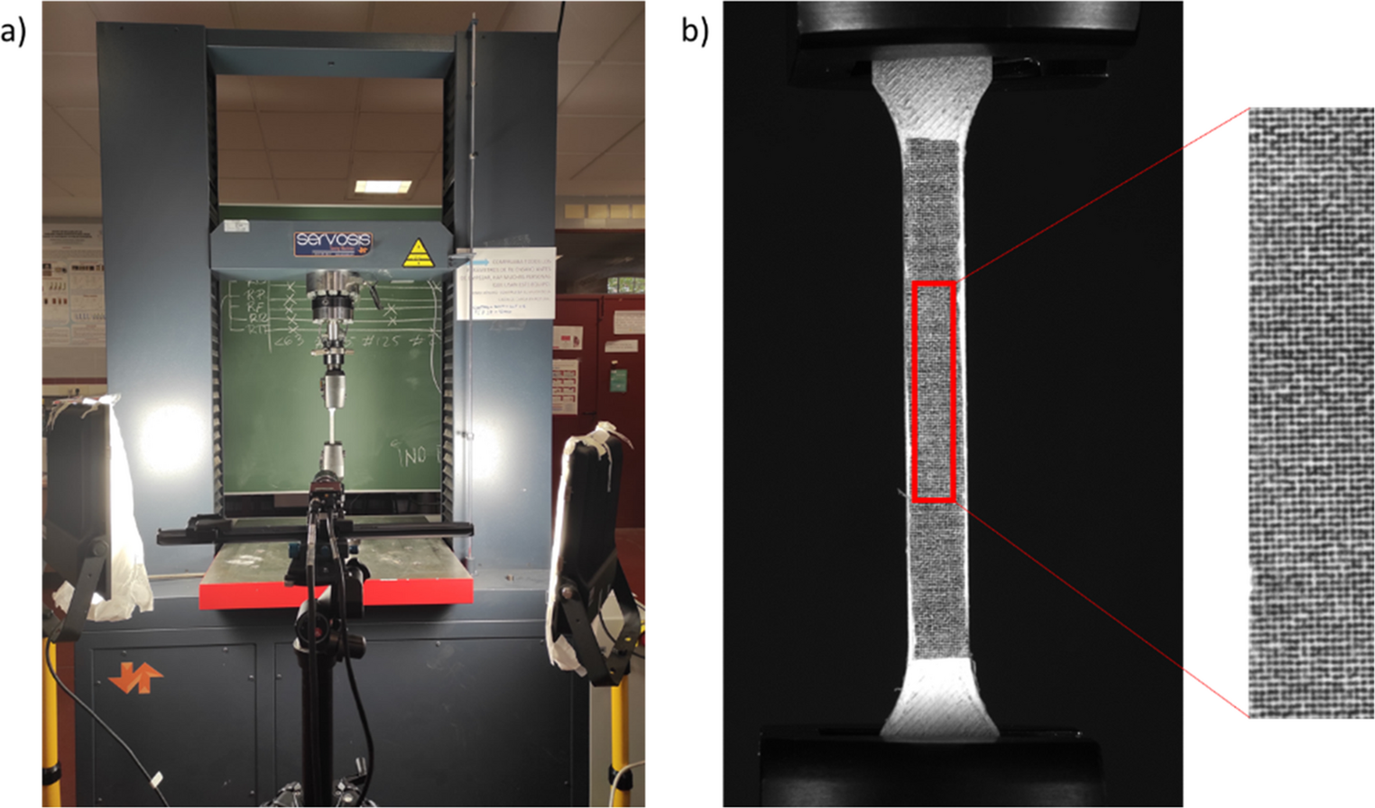 (a) Set up of the performed test and (b) computer-designed Speckle pattern used for DIC analysis