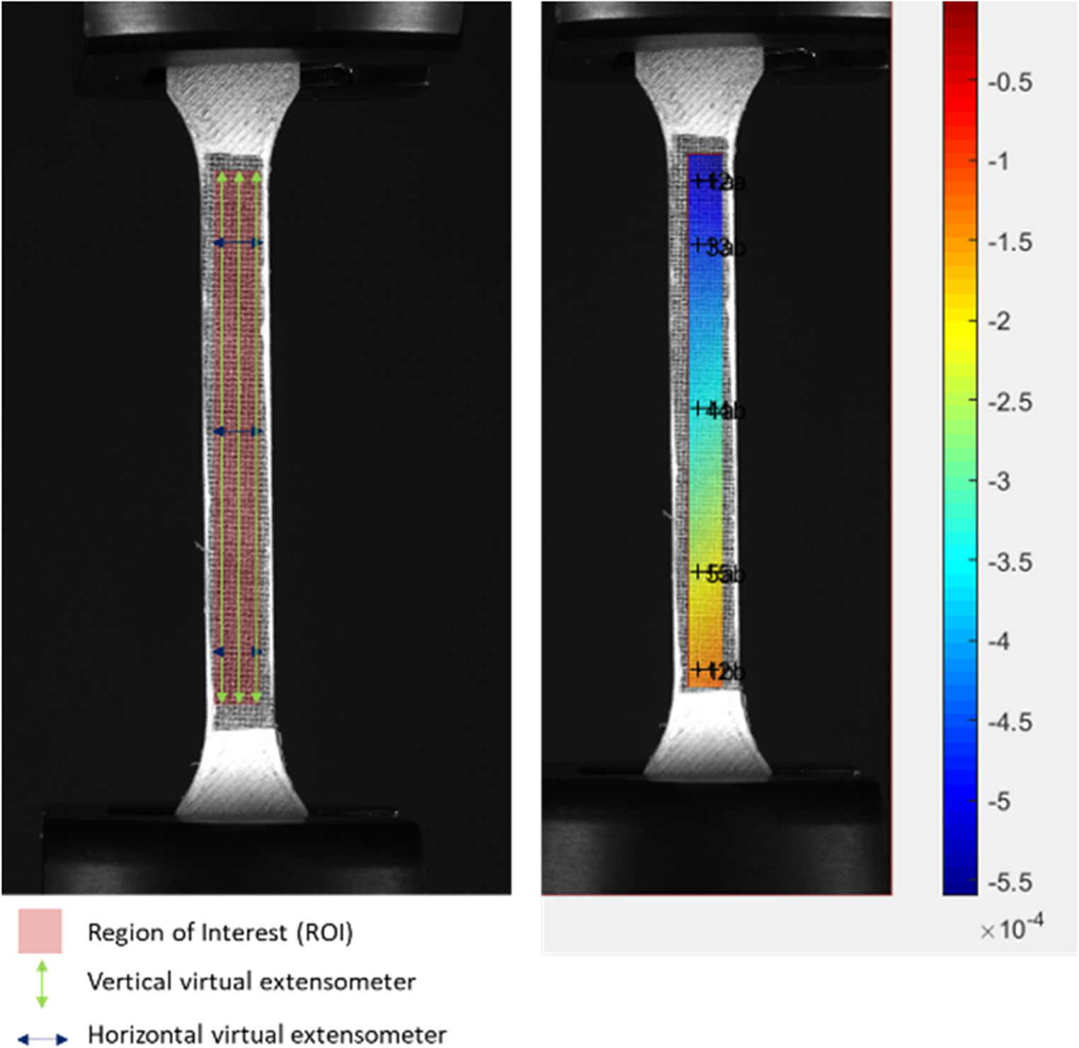 Results of the virtual extensometer. The image on the left shows the six virtual extensometers (three longitudinal in green and three transversals in blue) over the region of interest (ROI) in red. On the right, the distribution of deformations obtained after DIC analysis is shown