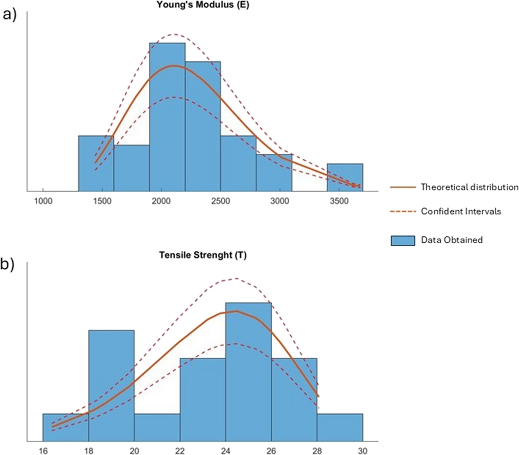 Graphical representation of the PDFs obtained by DIC. (a) Log-normal distribution of the young’s modulus (E) and (b) Weibull distribution of the tensile strength (T)