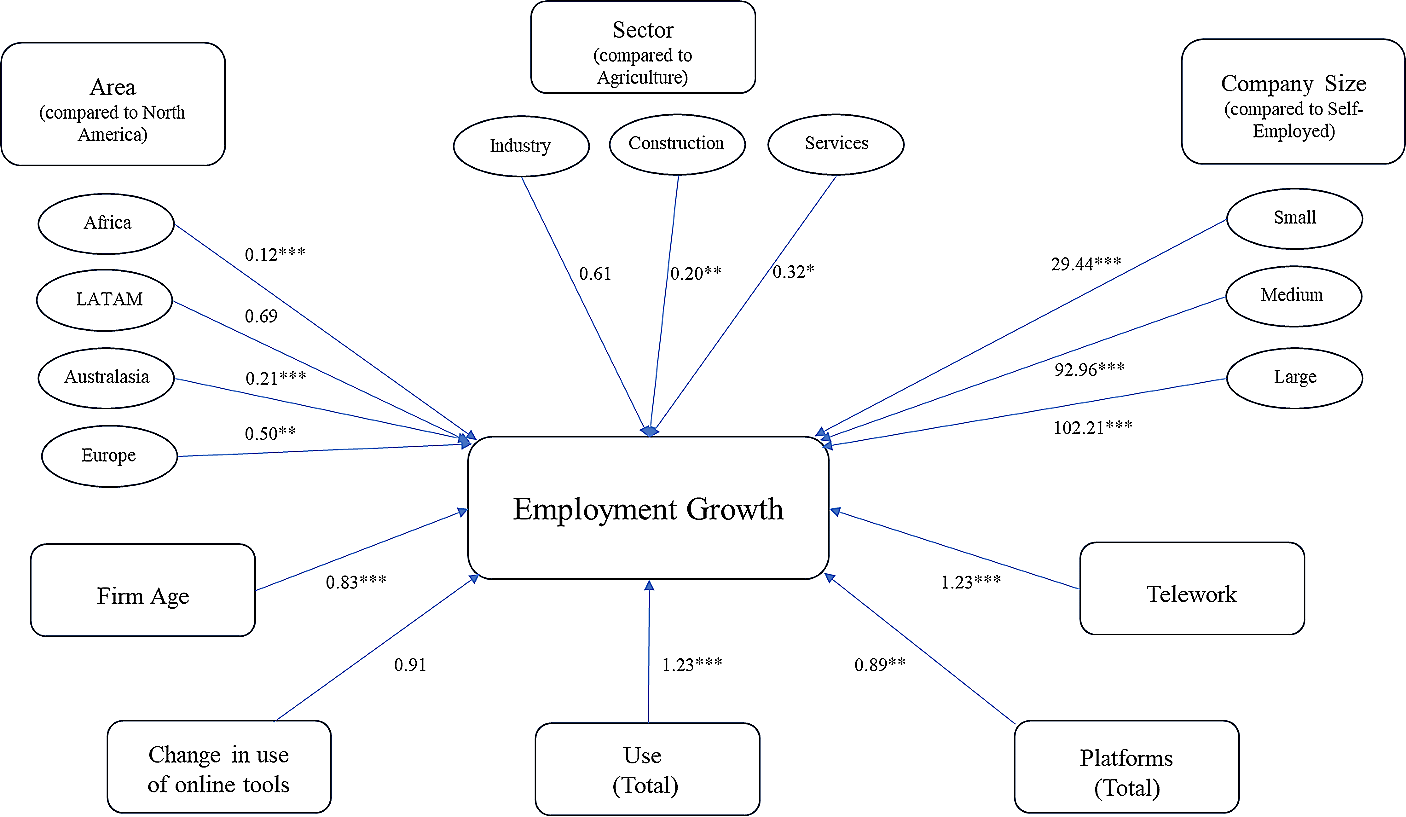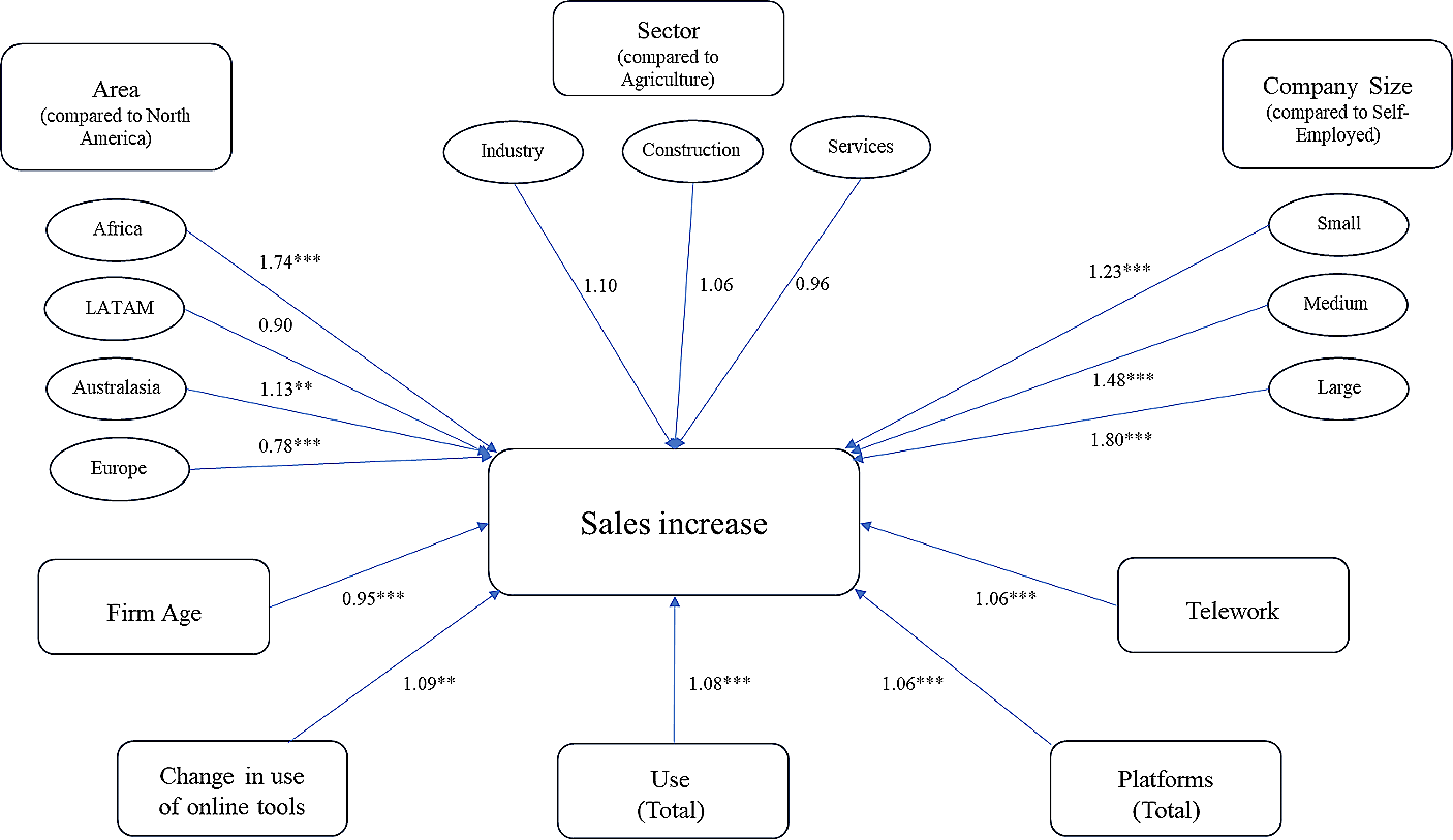 Finally, control variables are firm size, where there is no doubt that the larger the firm size, the greater the positive effect; firm age, which reveals an inverse relationship with the probability of better business performance; and the possibilities of teleworking (Heidt et al. 2023), which, in line with expectations, increase the probability of increasing sales and employment. Moreover, the greatest positive effects on sales and employment increases derived from digital tools are observed in North America; these effects could be related to sociocultural factors, ease of access to digital tools and platforms, the internationalization of their economy, market regulations and facilities in payment systems, among others. Surprisingly, however, the effect of the use of digital tools on employment and sales seems not to be affected by the sector of activity, despite other studies such as Truant et al. (2021) recognizing this relation.