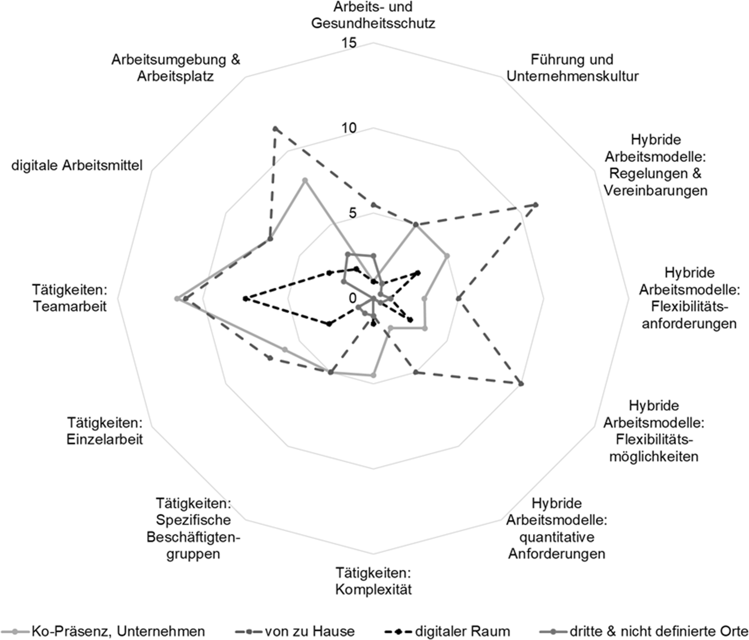 Hinsichtlich des Arbeitens von zu Hause sind die drei häufigsten Kategorien Arbeitsumgebung & Arbeitsplatz, Regelungen & Vereinbarungen sowie Teamarbeit. In Beiträgen, die eine physische Ko-Präsenz von Beschäftigten (im Unternehmen) betrachten, werden ebenfalls im Schwerpunkt die Arbeitsplätze und die Teamarbeit in den Blick genommen. Maßnahmen zum Arbeits- und Gesundheitsschutz werden dagegen für diesen Ort kaum einbezogen. Teamarbeit und vor allem Besprechungen werden häufig im Zusammenhang mit dem digitalen Raum als (gemeinsamen) Arbeitsort beleuchtet, die spezifisch hierfür genutzten digitalen Arbeitsmittel nehmen anteilig jedoch weniger Raum ein. In Kombination mit dritten sowie nicht weiter definierten Arbeitsorten wird vor allem die Arbeitsumgebung und der Arbeitsplatz, die Nutzung digitaler Arbeitsmittel und die Umsetzung des Arbeits- und Gesundheitsschutzes in den entsprechenden Beiträgen einbezogen.