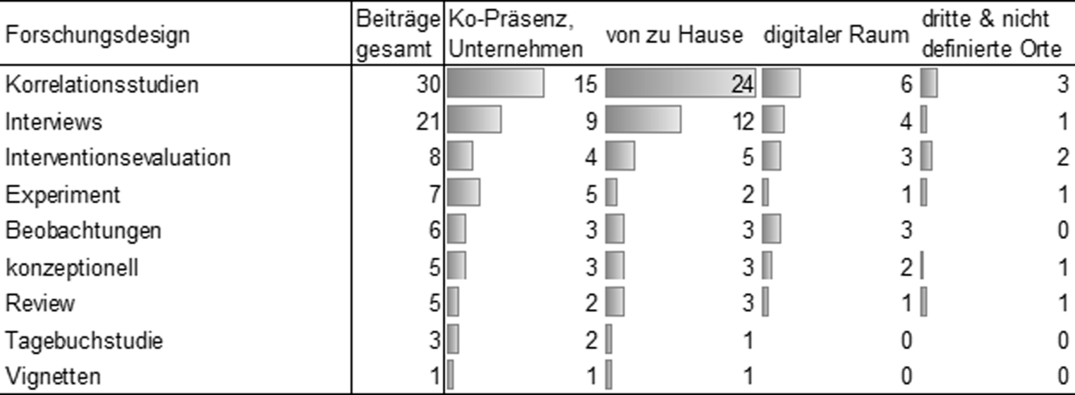 Über alle Arbeitsorte hinweg sind Korrelationsstudien basierend auf größeren Befragungen mit Abstand das am häufigsten genutzte Forschungsdesign (Abb. 2), gefolgt von qualitativen Interviews und Workshops. Gleichzeitig zeigt sich in den 60 Beiträgen die gesamte Spannbreite arbeitswissenschaftlicher Forschung. In 8 Beiträgen wird die Evaluation von in den Projekten entwickelten Tools und Maßnahmen berichtet.