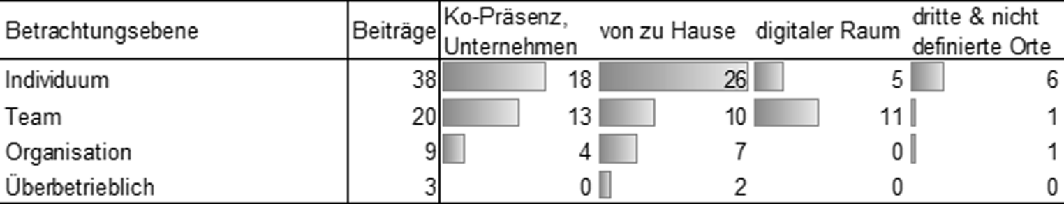 Die am stärksten vertretene Betrachtungsebene liegt auf dem Individuum. Besonders Beiträge zum Arbeiten von zu Hause oder an dritten bzw. undefinierten Orten legen den Fokus anteilig stark auf einzelne Beschäftigte (Abb. 3). Die Teamebene wird in 20 Beiträgen explizit herausgearbeitet, hier anteilig insbesondere in Beiträgen mit Berücksichtigung des digitalen Raums und in physischer Ko-Präsenz. Das Unternehmen bzw. die Organisation wird mit 9 Beiträgen bereits deutlich weniger berücksichtigt. Die überbetriebliche Ebene hybriden Arbeitens ist mit 3 Beiträgen kaum Teil der Forschungsperspektive.