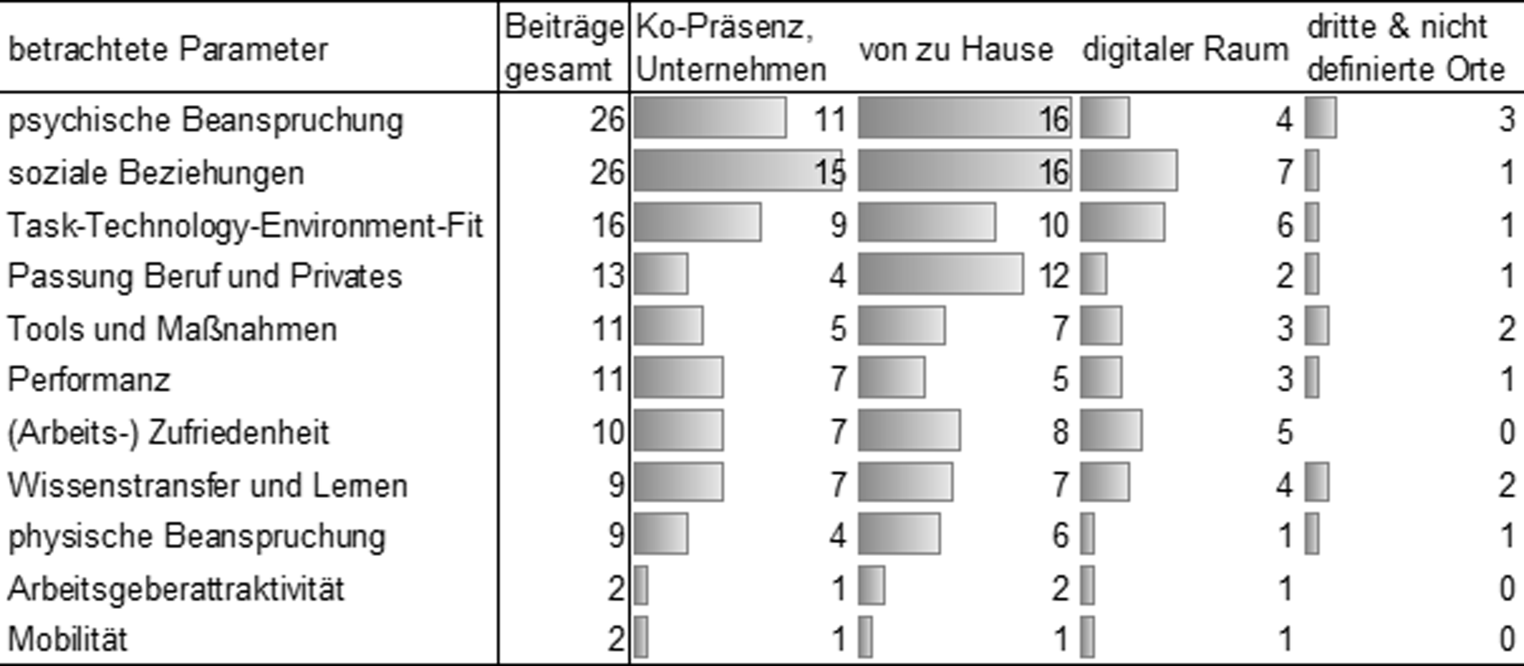 In den Beiträgen werden verschiedene Parameter betrachtet, wobei psychische Beanspruchung und Wohlbefinden sowie Quantität und Qualität sozialer Beziehungen die mit Abstand häufigsten Kategorien sind. Darüber hinaus wird die Passung von Beruf und Privatem in Kombination mit dem Arbeiten von zu Hause bearbeitet (Abb. 4). Gerade Beiträge, die sowohl das Arbeiten von zu Hause als auch in physischer Ko-Präsenz erfassen, benennen vermehrt Effekte im Zusammenhang mit der Performanz, der Zufriedenheit und dem Wissenstransfer. Die Passung von Arbeitstätigkeiten, den digitalen Arbeitsmitteln und der Umgebung wird anteilig besonders für den digitalen Raum herausgearbeitet, ebenso die Arbeitszufriedenheit. In den Beiträgen zu dritten und/oder nicht näher definierten Orten werden neben der psychischen Beanspruchung vermehrt Tools und Maßnahmen sowie Wissenstransfer und Lernen beschrieben.
