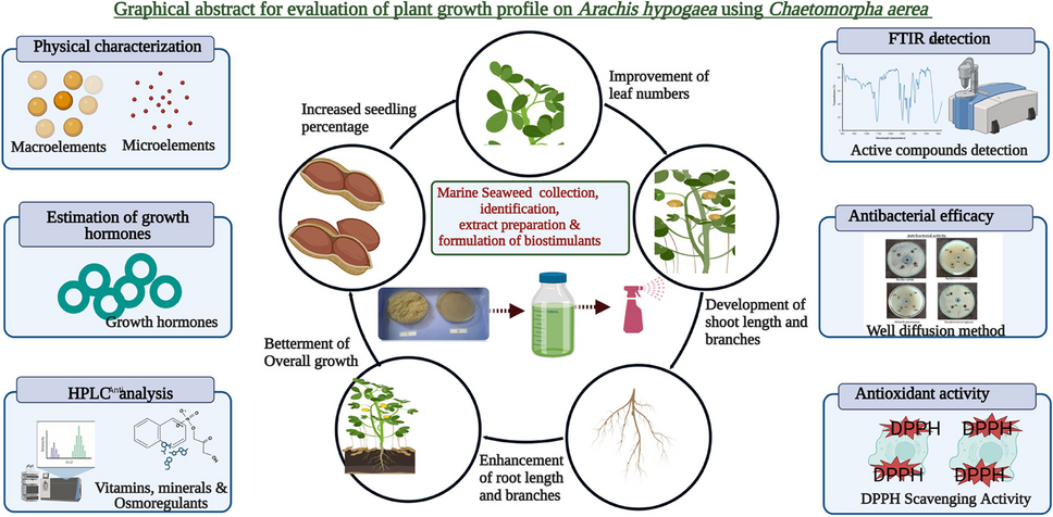 Current research breakdown explored the green seaweed Chaetomorpha aerea-based natural biostimulants as agricultural enhancers to improve the outputs of Arachis hypogaea. A pot experiment was conducted over a period of 12 days. Different concentrations of biostimulants were used, ranging from 1 to 5 kg, along with a control group. A fertiliser mix (NPK) was added to ensure optimal nutrient availability. Furthermore, field studies were conducted to evaluate the outputs for up to 120 days. Morphological profiles, including shoot longitude, spring shoot, overall leaves, root length, root branch, total plant height, and seed percentage, were measured. The experimentation revealed significant improvements in the growth and yield of Arachis hypogaea when treated with Chaetomorpha aerea-based biostimulants. The longest shoots and roots measured were 30.2 cm and 19.2 cm, respectively. The total height of the treated plants reached 49.4 cm, and the seeds treated with green algae exhibited a 100% germination rate. These findings highlight the effectiveness of Chaetomorpha aerea in promoting plant growth and enhancing crop yield. In addition to the morphological measurements, biochemical analysis was conducted to understand the active compounds in Chaetomorpha aerea. Osmo-regulators, plant growth hormones, vitamins, and amino acids were analysed to determine their role in promoting plant growth and development. Furthermore, mineral assessment was conducted using energy-dispersive X-ray spectroscopy (EDAX) to understand the nutrient composition of the biostimulant. FTIR was used to assess the alcoholic compounds and amine functional groups. The antibacterial efficacy of Chaetomorpha aerea-based biostimulants was assessed against common plant pathogens, including Bacillus subtilis, Klebsiella pneumonia, Staphylococcus aureus, and Pseudomonas aeruginosa. The results showed a significant inhibition of bacterial growth, with a zone of inhibition measuring 13 mm and 11 mm in Bacillus subtilis and Pseudomonas aeruginosa, respectively. This suggests that Chaetomorpha aerea-based biostimulants can potentially control bacterial infections in crops. Furthermore, the in vivo-antioxidant activity of the biostimulant was measured using the DPPH radical scavenging activity method. The results showed a scavenging activity of 68.46% at a concentration of 150 µg/mL. This indicates that Chaetomorpha aerea-based biostimulants possess antioxidant properties that can help protect plants from oxidative stress and improve overall plant health. With its eco-friendly and sustainable nature, Chaetomorpha aerea-inspired biostimulants hold great promise for the future of agriculture. Embracing these natural alternatives can not only contribute to increased crop productivity but also help protect the environment and promote sustainable farming practices.