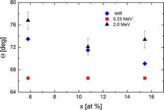 The irradiation-induced change of Θ evidently depends on the energy of the ions. Whereas the less energetic ions decrease Θ in a way that seems to depend on the composition, the more energetic ions act in the opposite way, i.e., they increase Θ with the minimum at x = 10.75. Although the revealed changes in Θ are rather small, evidently the effect of the 0.25 MeV ions is opposite to the one due to the 2.0 MeV ions.