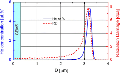 He-concentration profile and radiation damage calculated by the SRIM code for the Fe89.25Cr10.75 sample irradiated to the dose of 7.5 dpa with 0.25 MeV He+ ions vs depth, D. The presurface zone accessible to the CEMS measurements is marked by a vertical stripe