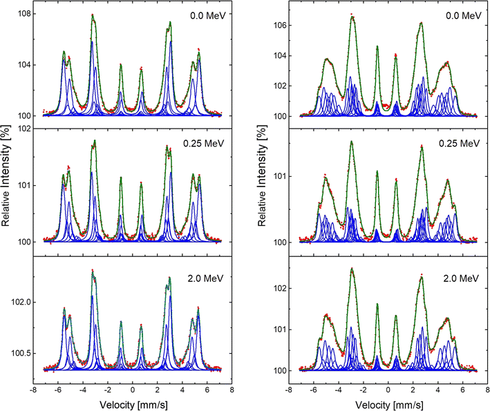 CEMS spectra recorded at RT on Fe94.2Cr5.8 (left panel) and Fe84.85Cr15.15 (right panel) samples irradiated with He+ to the dose of 7.5 dpa. The energy of the ions is indicated by labels. The spectra recorded on non-irradiated surfaces are labeled by 0.0 MeV