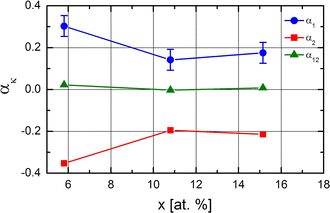 SRO parameters α1, α2, and α12vs Cr content, x, as determined from the spectra recorded on the non-irradiated surfaces of the Fe100−xCrx samples