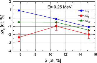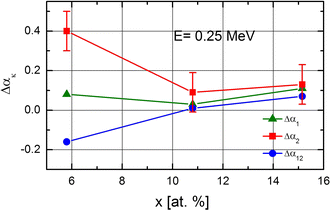 To extract the effect of irradiation, a difference in xk, Δxk = xk(IR) − xk(NIR), has been calculated for all k = 1, 2, 12, and both energies. The output of these calculations is presented in Figures 8 and 9 for 0.25 and 2.0 MeV, respectively.