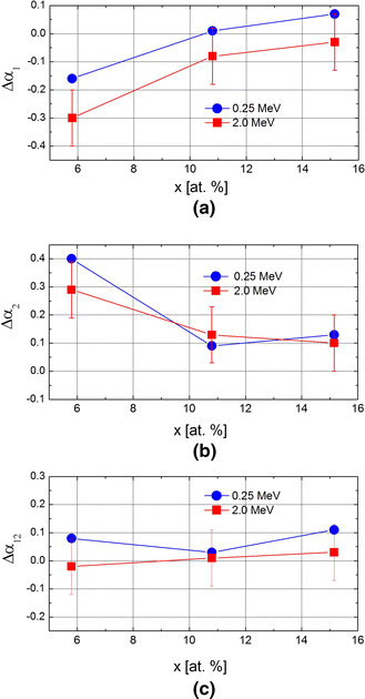 In order to study whether the effects of irradiation depend on the energy of He+ ions and alloy composition, all three samples were irradiated at room temperature (290 K) to a dose of 1.2 × 1016 He+/cm2 (7.5 dpa) with 0.25 and 2.0 MeV ions. The spectra recorded for two samples with the end-member compositions are displayed in Figure 3. Based on their analysis, as described in Section II–A, and Eq. [1], values of the SRO parameters α1, α2, and α12 were determined from both the spectra recorded on NIR as well as on IR sides of the samples. The values of the SRO parameters calculated from the spectra recorded on the non-irradiated surfaces are shown in Figure 4.