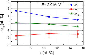 Dependence of Δxk (k = 1, 2, 12) on Cr concentration, x, for the samples irradiated with 0.25 MeV He+ ions. The lines are to guide the eye