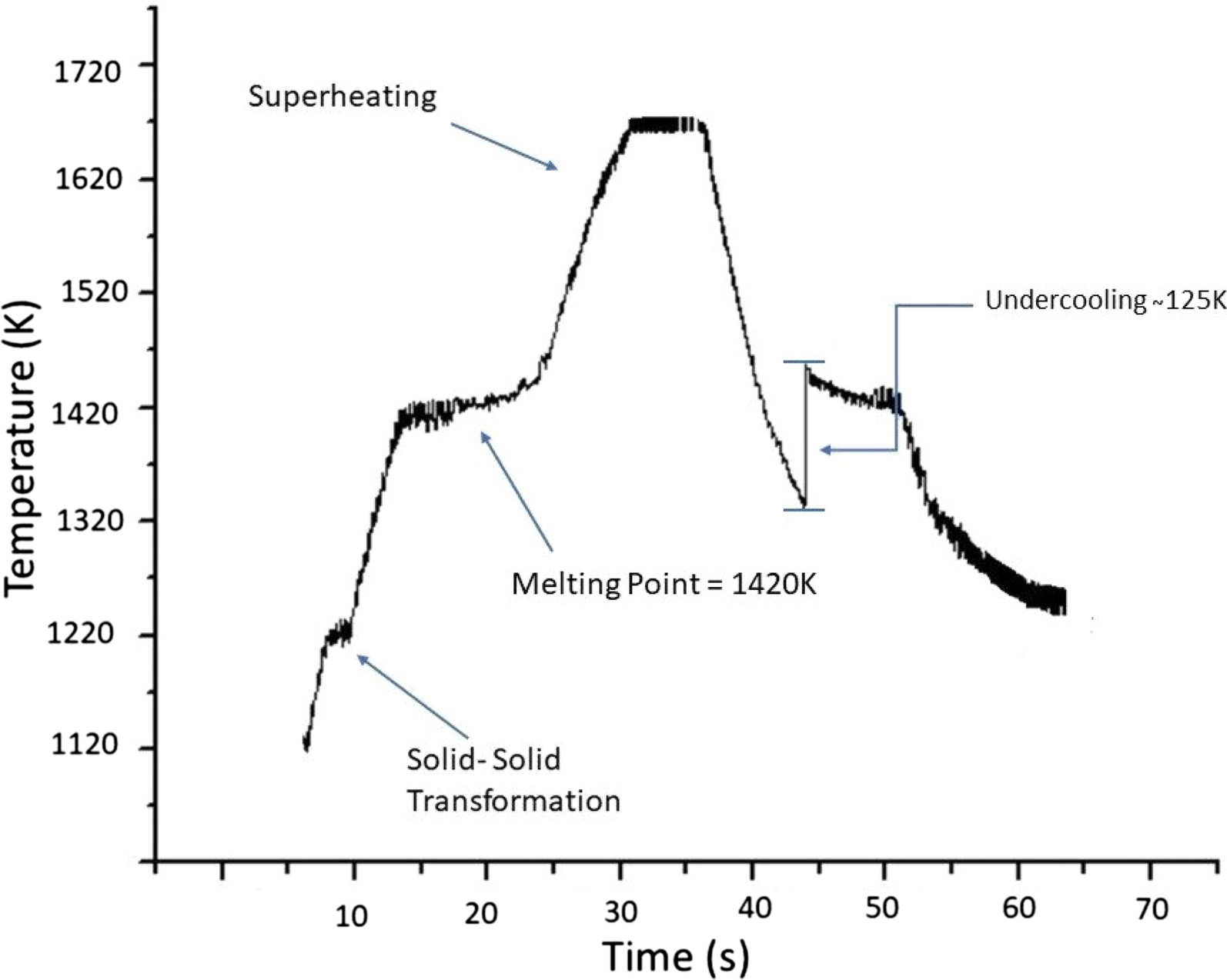 As the sample is heated up from room temperature, it undergoes a solid-solid transformation at 1220 K from low temperature Ni3Sn hexagonal phase to high temperature Ni3Sn cubic phase. As the temperature is further increased, the sample undergoes melting at around 1420 K which is the liquidus temperature on the phase diagram. The temperature remains constant till the entire sample is molten. The sample is then superheated for some time at higher temperature before it is cooled down. Due to the container-less nature of the solidification process, the sample does not solidify at the equilibrium melting point. Instead, it can be significantly undercooled below its liquidus before the solidification process starts, depicted by a sharp increase in temperature due to recalescence. The portion of sample solidified during the recalescence phase is directly proportional to the undercooling prior to solidification. After a portion has been solidified during the recalescence phase, the remaining solidification takes place over a narrow melting temperature range. As soon as the whole sample solidifies, the temperature goes down further. At room temperature, the Ni3Sn exists as the low temperature hexagonal phase.