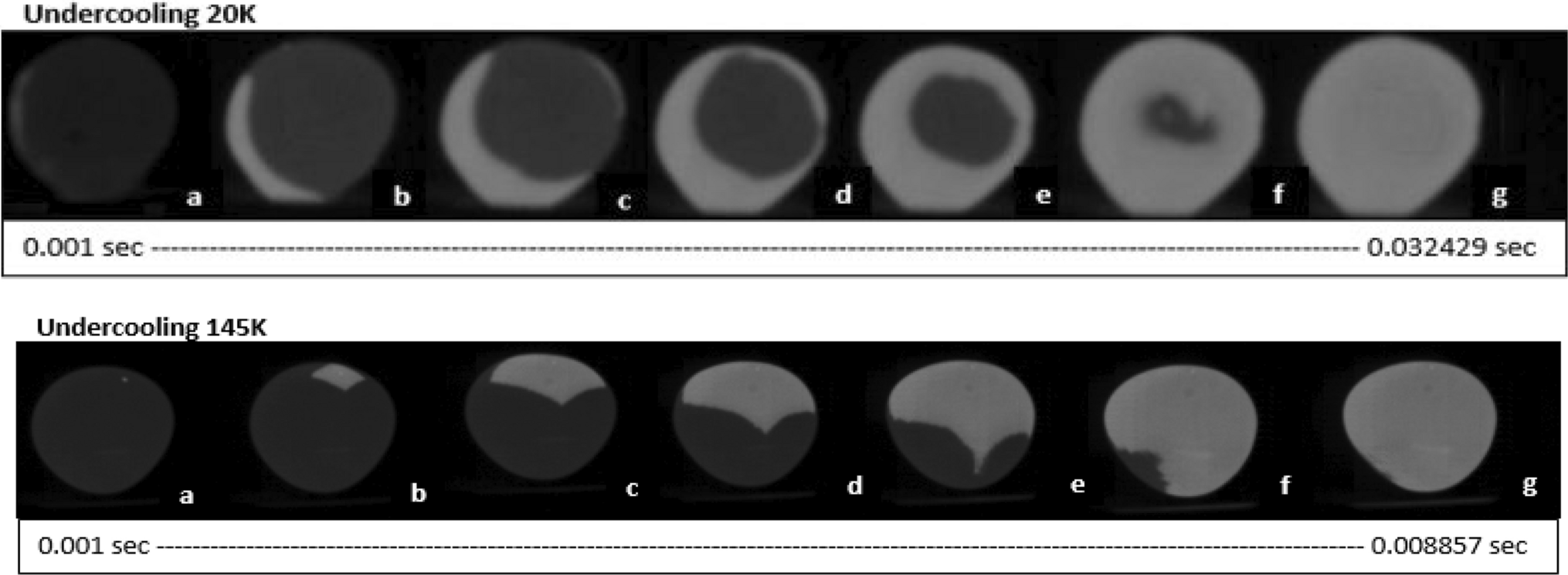 High speed video camera images of solidification fronts, above) undercoolings of 20 K and below) undercooling of 145 K