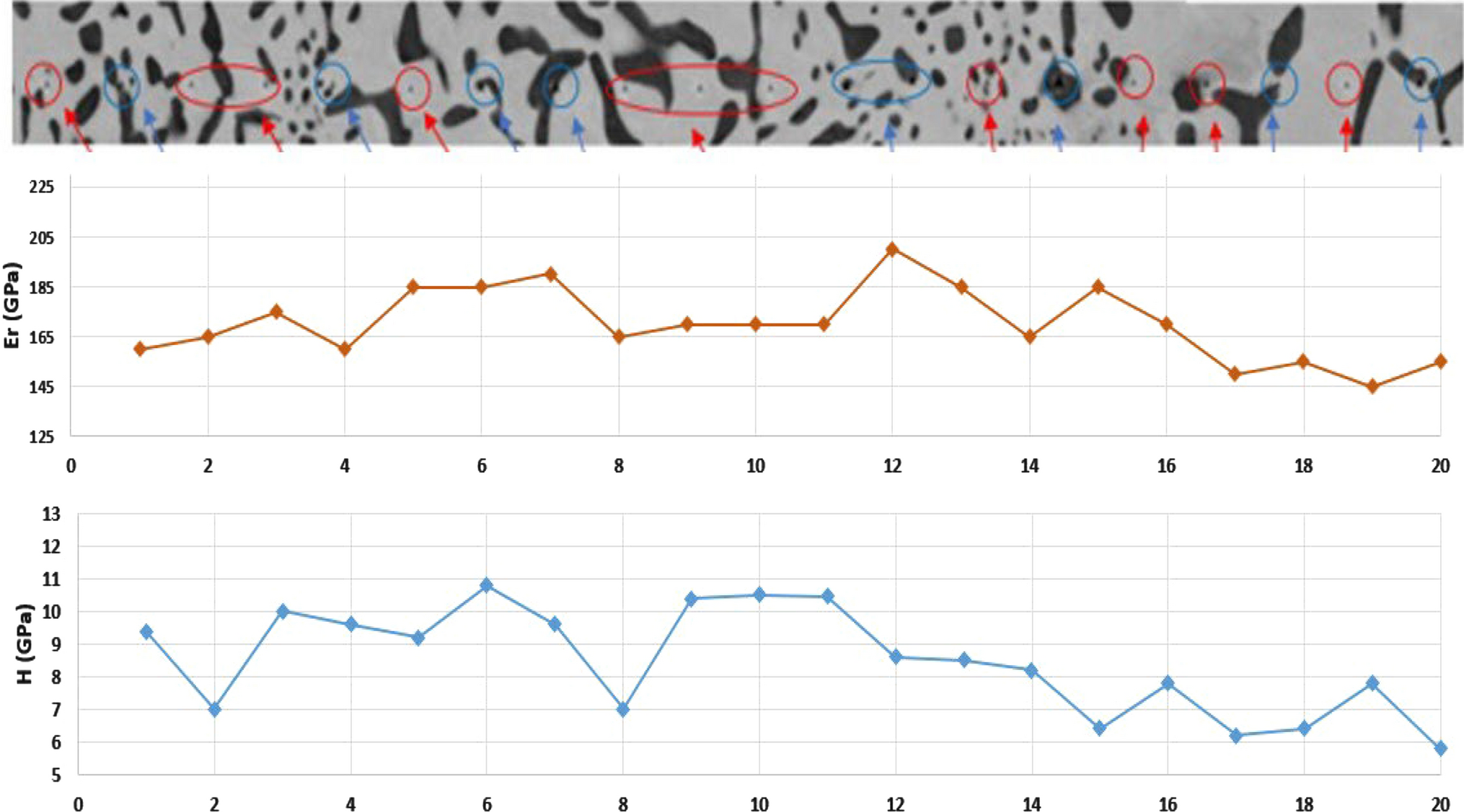 Nano-indentation was performed to determine the hardness of individual phases present in the microstructure. Two samples, solidified at different undercoolings, were chosen for the nano-indentation testing. More than 50 indents were made on both the samples to determine the hardness of different phases. After nano-indentation, SEM was performed using BSE detector to identify the location of each indent and correlate it with the hardness value. Nano indentation for the sample solidified at 165 K is shown in Figure 6 along with the hardness and elastic modulus. The nano-indents on Ni3Sn phase have been encircled in red whereas the nano-indents on the α-Ni phase have been encircled in blue. The hardness of the α-Ni phase has been found to be in the range of 6–7 GPa while that of Ni3Sn phase is in the range of 10 GPa. The lowest values have been achieved when the nano-indents lie completely on the α-Ni phase. The values of hardness obtained nano-indentation are higher than the ones shown by micro-hardness technique. This is due to the indentation size effect (ISE), which says that the crystalline materials often show depth-dependent hardness until the indentation depth is larger than 1 µm.[26‐28] Below the indentation depth of 1µm, most crystalline materials show higher strength and hardness. As the depth of nano-indents in the current study is always below 100 nm, the measured values of hardness are in accordance with the above-mentioned indentation size effect.