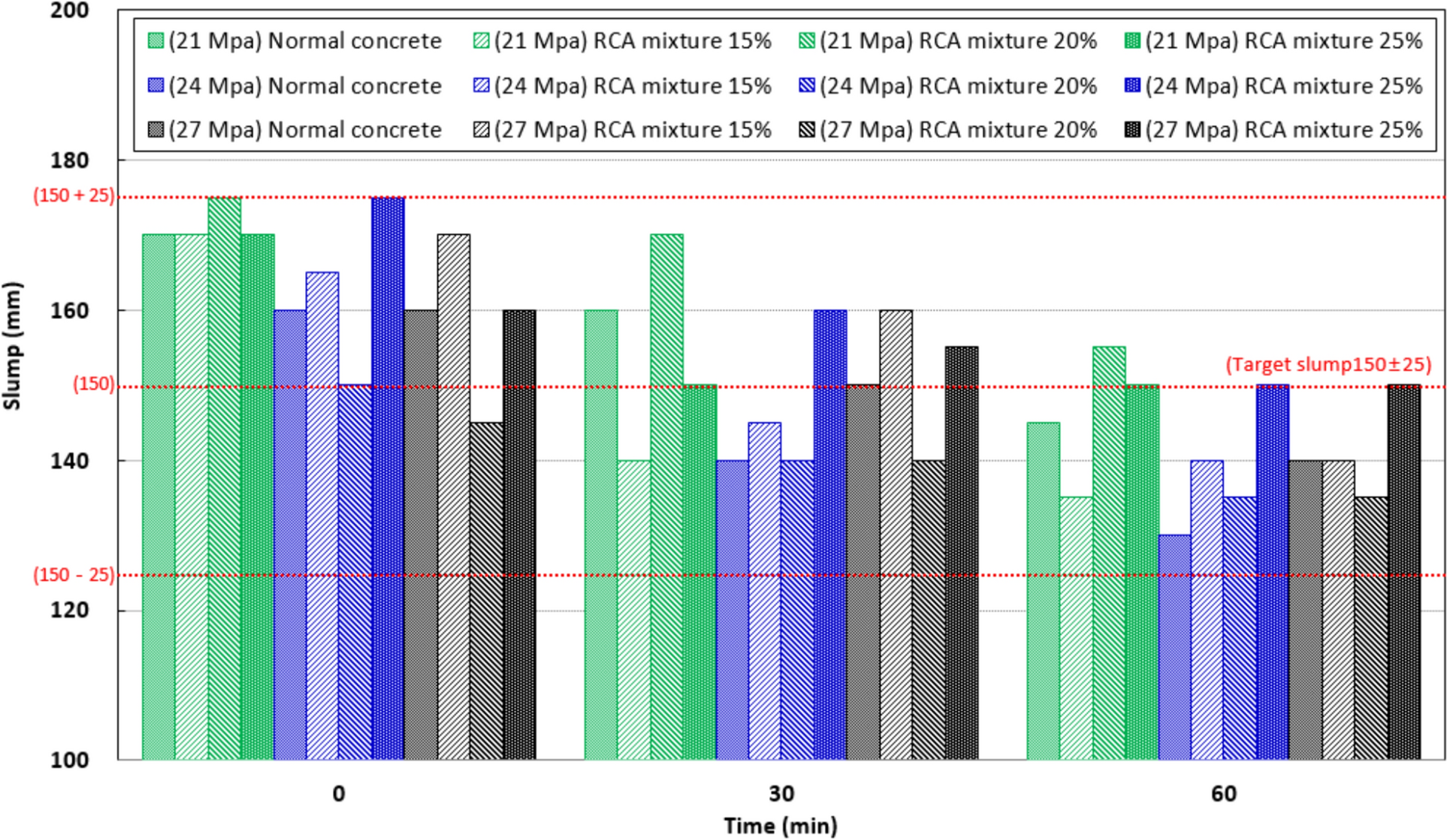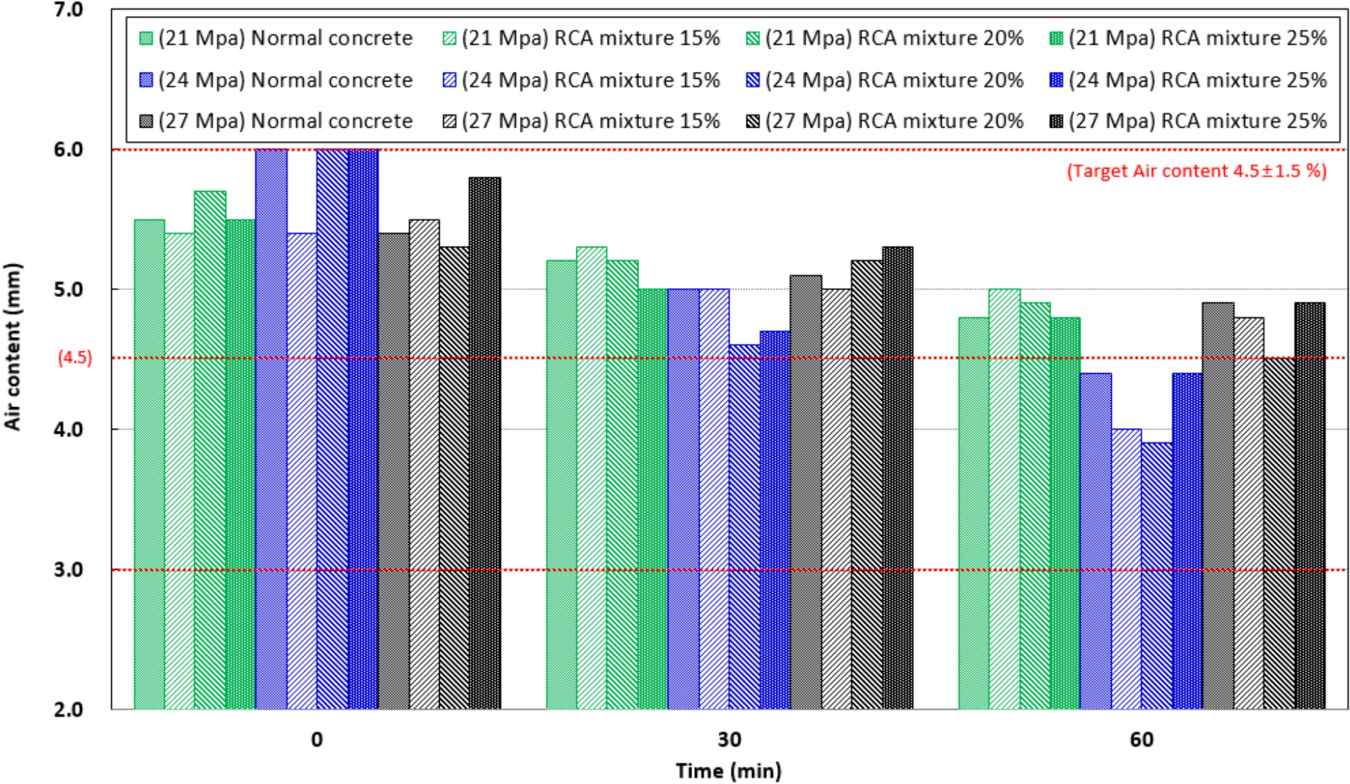 In this study, design strengths of 21, 24, and 27 MPa were considered. The quality of recycled aggregate concrete is managed by KCS 14 20 21 recycled aggregate concrete standards of the Korean Architectural Standard Specification [5], and KCS 14 20 10 general concrete specifications are applied [6]. Based on the specifications, a target slump of 150 ± 25 (125 ~ 17 5) mm, and a target air content of 4.5 ± 1.5(3.0 ~ 6.0)% were set. Mixing ratios of recycled coarse aggregate to total aggregate of 15, 20, and 25% were selected based on the 2018 utilization standards for recycled building materials (Ministry of Land, Infrastructure and Transport, Notice 522). Corresponding concrete mixes were designed for each mixing ratio [7]. The mixing ratio of recycled coarse aggregate compared to the total coarse aggregate amount (recycled coarse aggregate: crushed coarse aggregate ratio) was set to 0:100, 30:70, 40:60, and 50:50. To analyze the physical properties of recycled aggregate concrete, the slump and air content of the fresh concrete were measured over time.