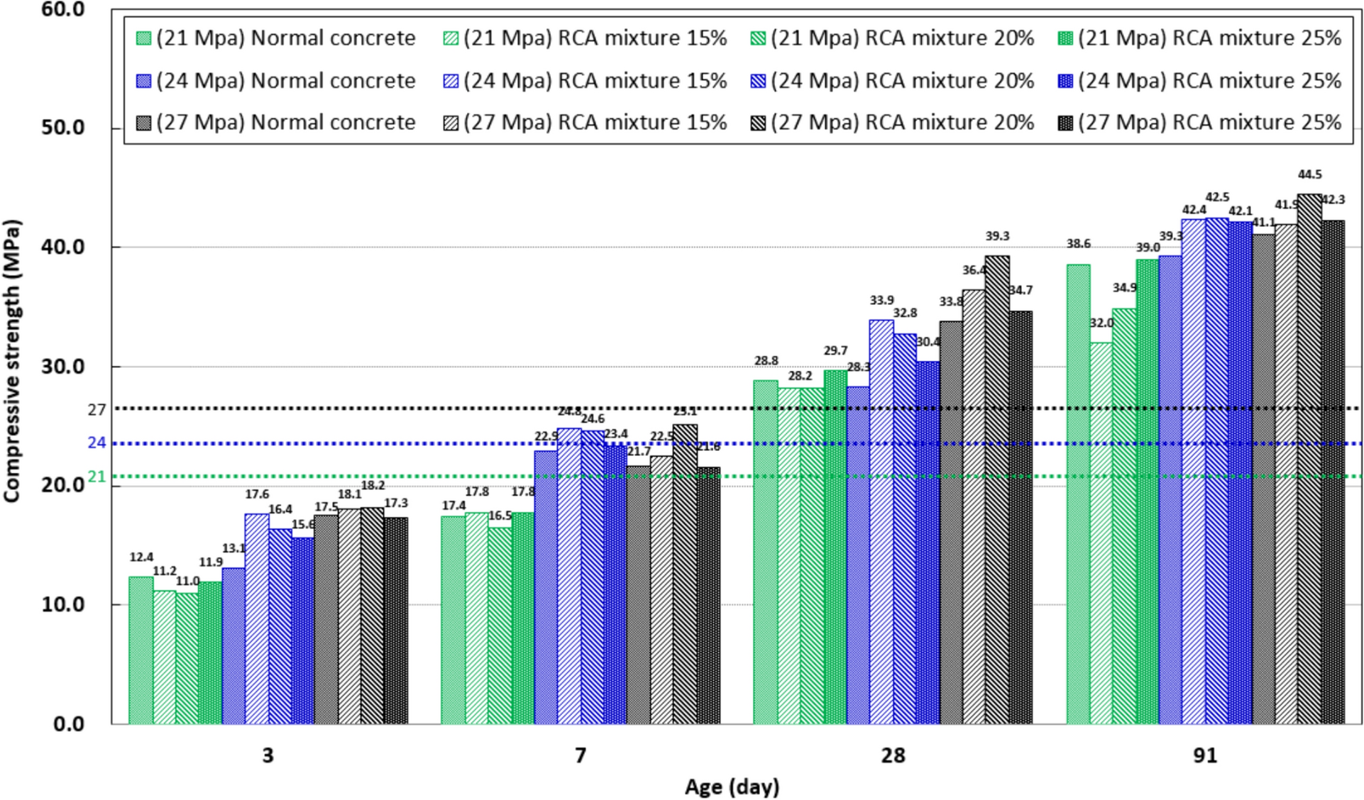 4. As the proportion of recycled coarse aggregate increased, the compressive strength of recycled aggregate concrete either matched or exceeded that of conventional concrete. Moreover, there was no decline in strength observed with an extended aging period, suggesting that it is indeed possible to achieve the desired strength in comparison to the design strength.