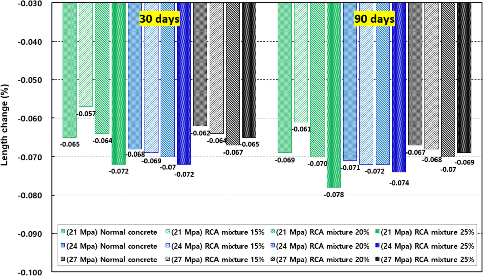 5. The length change in recycled aggregate concrete, at mixing ratios of 15%, 20%, and 25% for recycled coarse aggregate, is −0.001% to −0.009% for 21 MPa, −0.001% to −0.004% for 24 MPa, and −0.001% to −0.005% for 27 MPa when compared to conventional concrete. At 21 MPa, an increase in the recycled aggregate mixing ratio resulted in a 3–4% lower freeze-thaw resistance compared to regular concrete, while at 24 and 27 MPa, the freeze-thaw resistance improved with recycled aggregate mixing ratios of 20% and 25%. To maintain consistent quality in recycled aggregate concrete, it is advisable to implement measures aimed at mitigating drying shrinkage and freeze-thaw effects, such as the addition of appropriate admixtures.