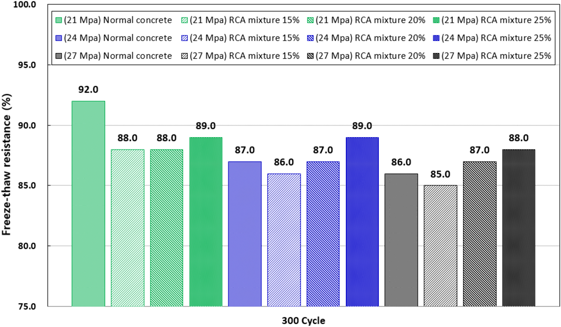 The compressive strength was measured at 3, 7, 28, and 91 days of age for hardened concrete. In addition, the durability of recycled aggregate concrete was evaluated by measuring the length change after 30 and 90 days, and monitoring freeze–thaw for 300 cycles. Table 1 shows the experimental variables considered.