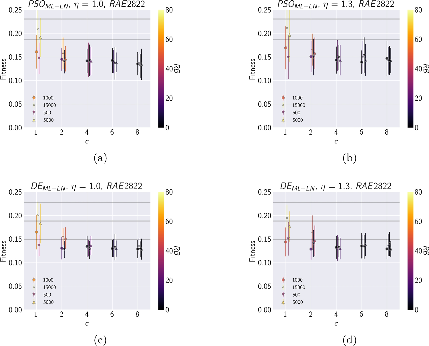 Results from the ML-enhanced framework for RAE2822 include the following boundary refinement configurations: (a) \(PSO_{ML-EN}\), \(\eta\) = 1.1 (b) \(PSO_{ML-EN}\), \(\eta\) = 1.2 (c) \(DE_{ML-EN}\), \(\eta\) = 1.1 (d) \(DE_{ML-EN}\), \(\eta\) = 1.2. The markers denote the different dataset sizes used to train the ML model, while the coloring of the markers represents the remaining simulation budget (RB) values. A higher RB signifies greater savings in the computational budget, while low fitness values imply a better approximation of the target performance. The markers are slightly offset for each c value to improve visibility