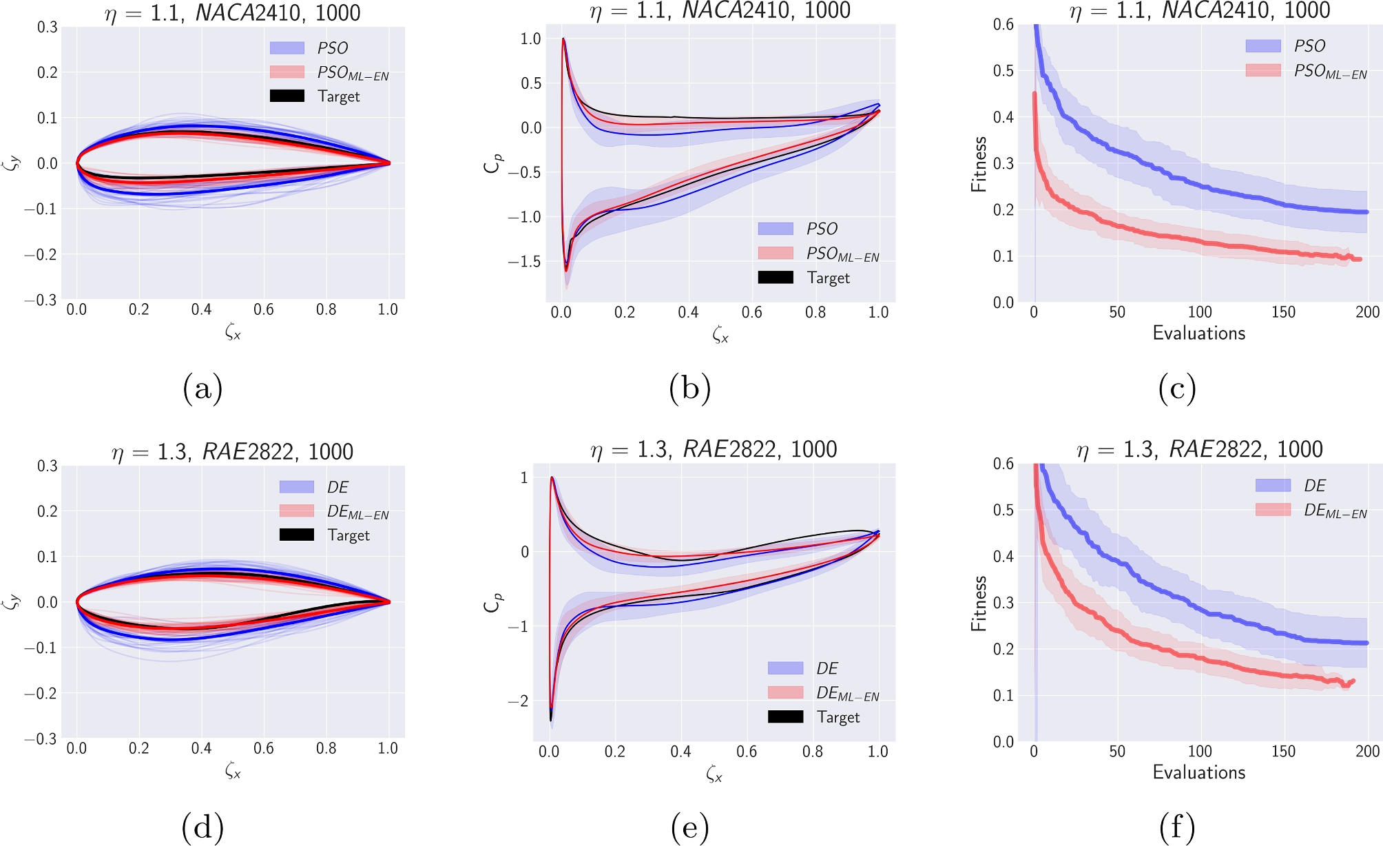 Finally, the design vector \(\mathbf {x_{A_\eta }}\) represents an airfoil shape itself, i.e., its design variables are the lower and upper B-Spline coefficients, hence, new lower and upper boundaries (\(\textbf{lb}_R\) and \(\textbf{ub}_R\)) are constructed based on this design vector for the AID problem. Different values of hyperparameter \(\eta\) are investigated to assess their impact on the performance of the ML enhanced optimization, more specifically, \(\eta \in \{1, 1.1, 1.2, 1.3\}\). These values showcase a range from less efficient to more efficient performance to provide a comprehensive view of the method’s effectiveness.